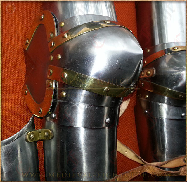 This pair of arm harness come complete with vambrace and full articulated elbow that offers fantastic movement and arm protection for re-enactors. Made from 16 guage (1.5mm) steel and trimmed with 1mm brass.