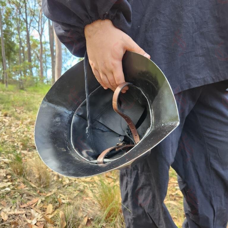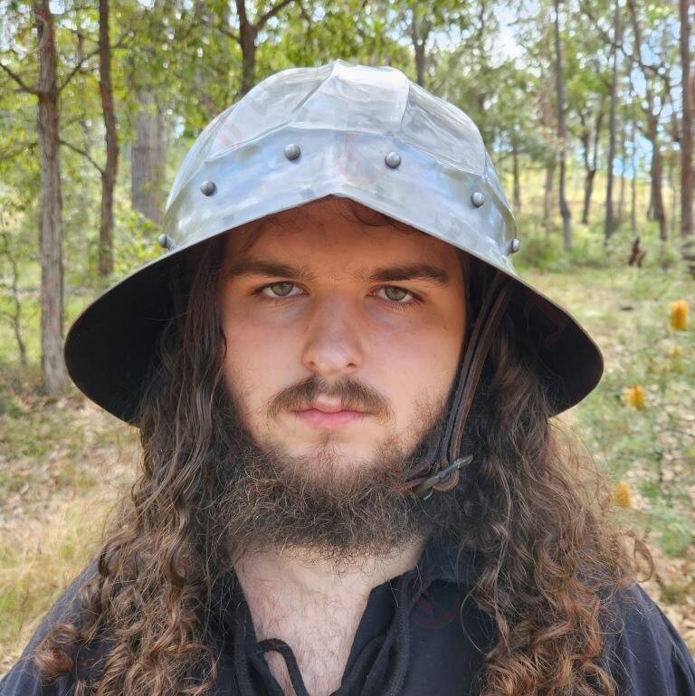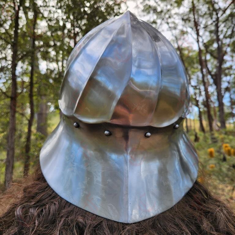This particular Kettle Hat is based off of a real find from 15thC Flanders and Burgundy. Its spiral shape and curves are hallmarks of the artistry and skill involved in late medieval armour crafting. The curved shapes of armour from this time assist in the deflection of strikes away from the armour, protecting the wearer even more than simple steel plate would.