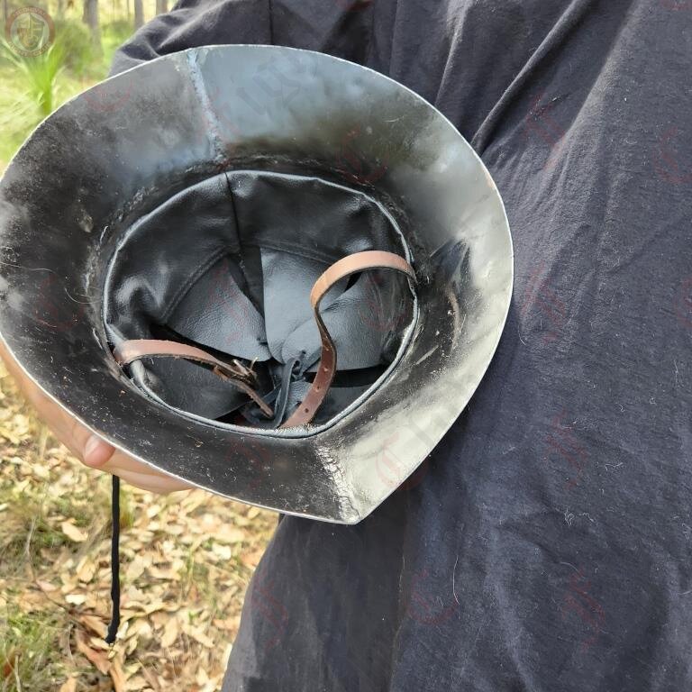 This helm comes with adjustable leather webbing and sturdy chinstrap with a period appropriate buckle. The helmet is 16ga steel.