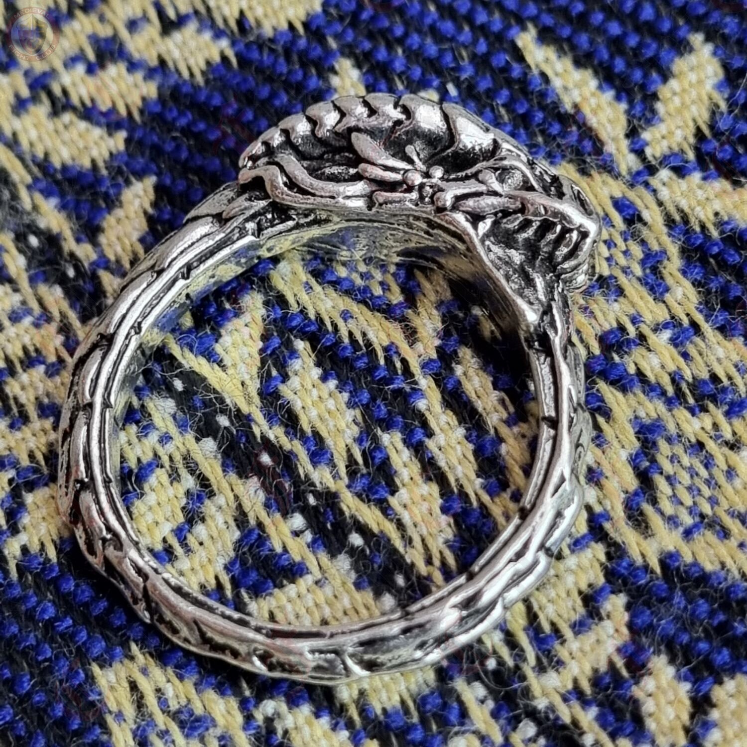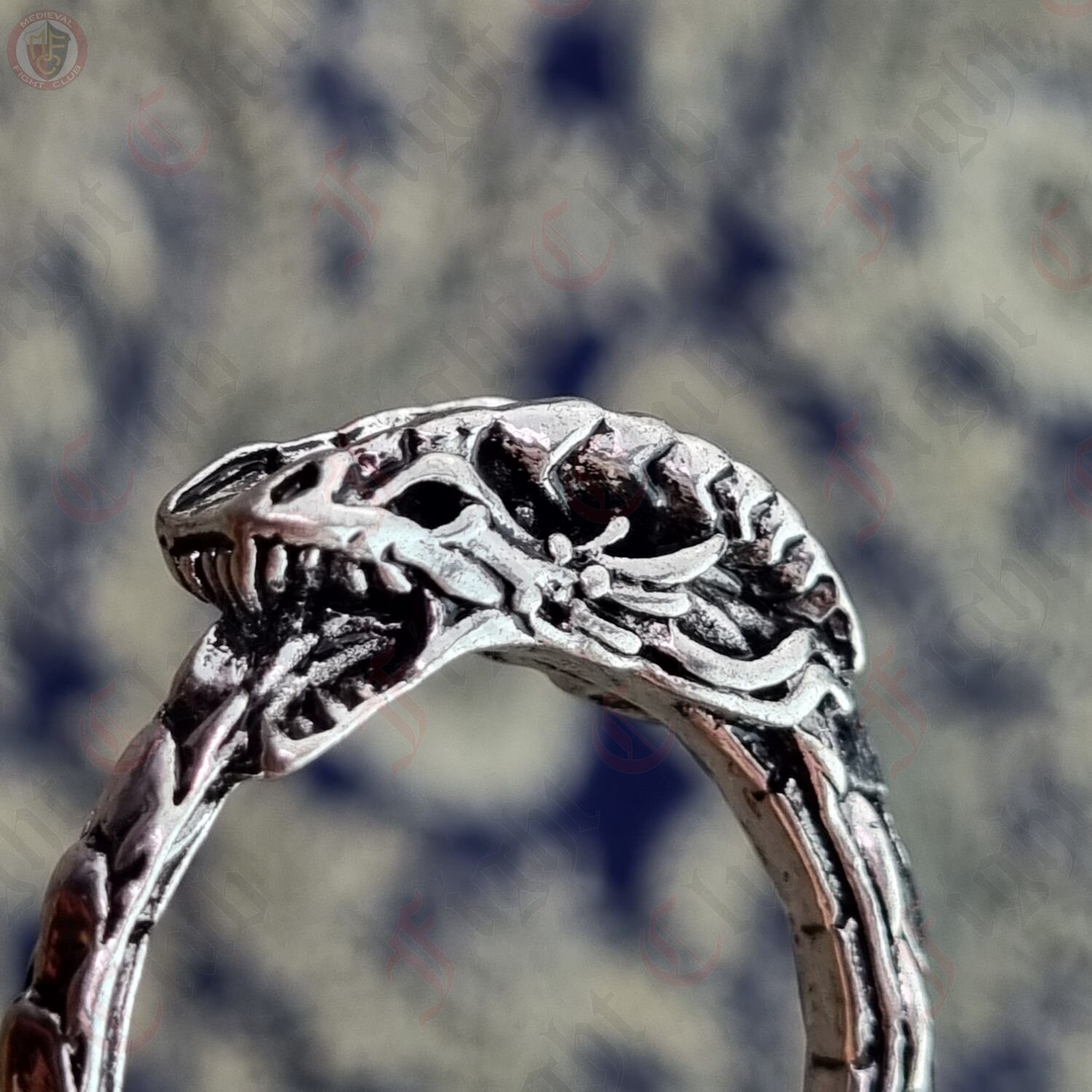 This Silvery Serpent ring depicts Ouroboros, the mythical serpent that eats its own tail. It often represents the eternal cycle of life, death, and the passage of time and is a powerful symbol steeped in history, tracing all the way back into Ancient Egypt. Snake symbology is extensive and varied. Where some would see a symbol of greed or avarice, the snake can also be a symbol for fertility.
