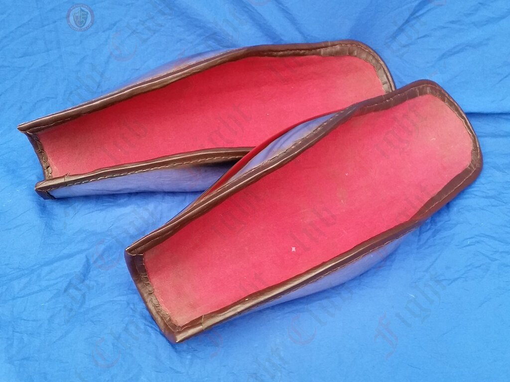 Often in matched pairs ( a pair of greaves), greaves may be constructed of materials ranging from padded cloth to steel plate - as here. Some designs protect only the lower leg (a half-greave) or extend upwards to protect the thigh
