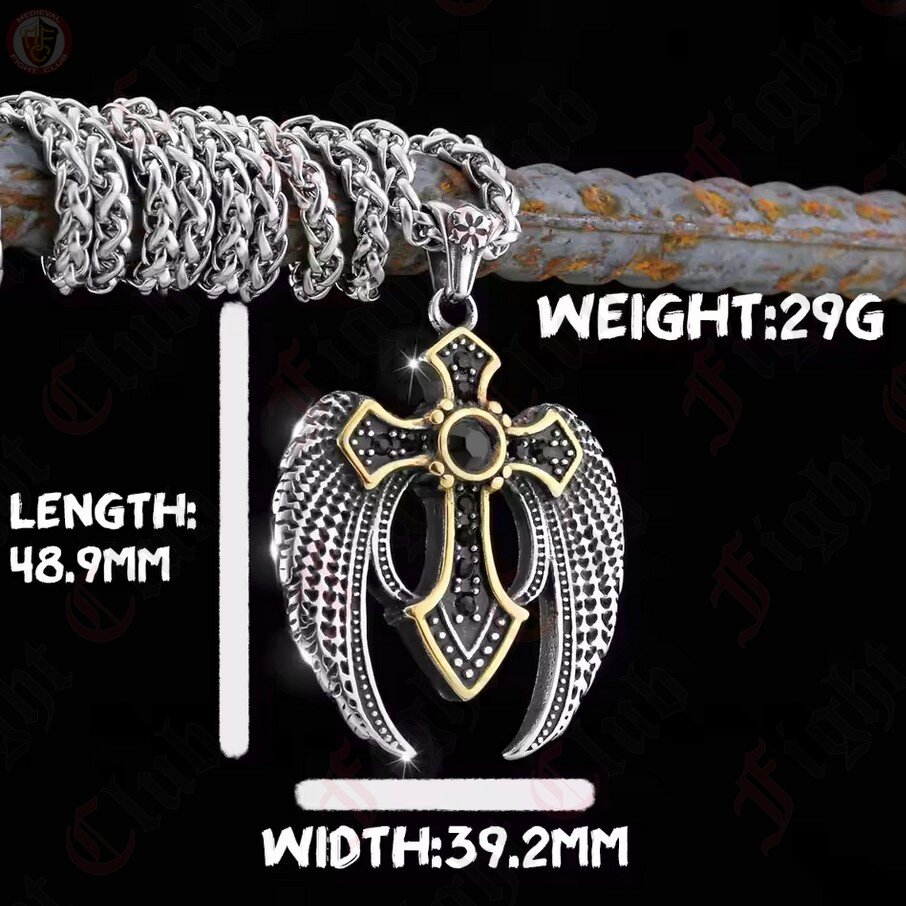 This striking necklace features a finely crafted crucifix embraced by a pair of detailed angel wings, symbolising faith, protection, and spiritual grace. Made from high-quality stainless steel, it offers lasting durability and a polished finish that resists tarnish and wear.