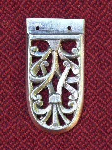 Bronze strapend with openwork ornament of acanthus-derived tendrils. Broad tongue-shaped strapends with foliate decoration were introduced to England via Continental influence in the 10th century, eventually supplanting the native narrow animal-ornamented style. This is a late example - though stratigraphy does not allow dating closer than the 11th to mid-12th century, the plant stem ornament has closest parallels in southern English manuscripts of the second quarter of the 11th century. Suits this buckle.