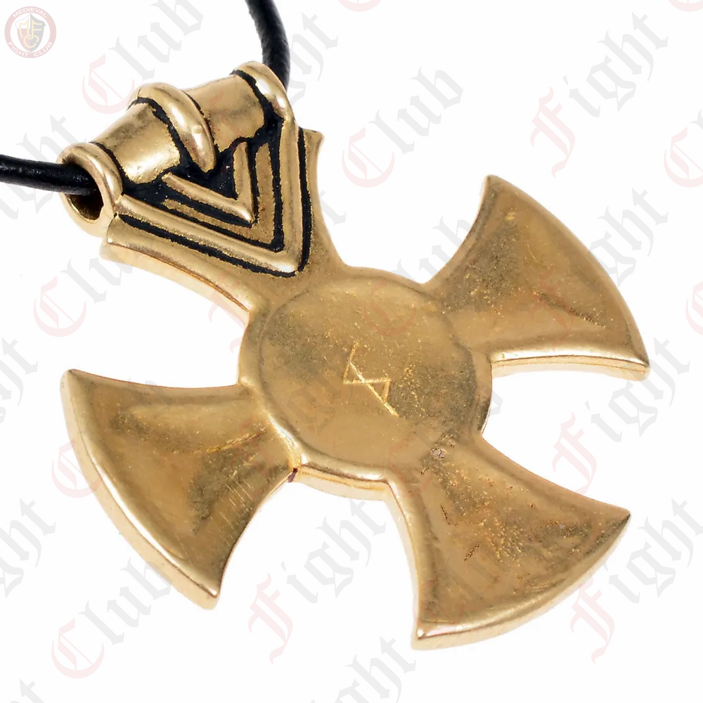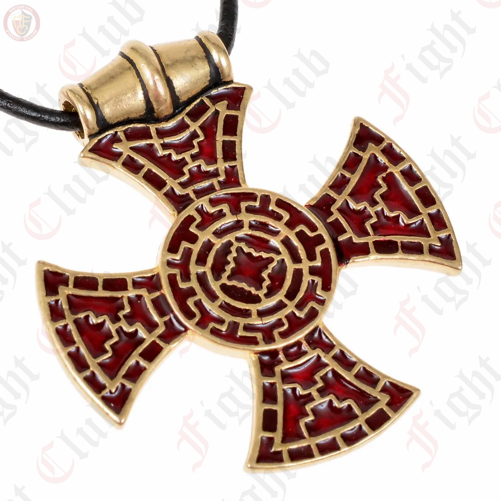 This detailed replica of an Anglo-Saxon cloisonné pendant was made after the Ixworth Cross, which dates back to the English Merovingian period. The Ixworth Cross was found in 1856 in the English town of Ixworth, Suffolk, next to a disc brooch in an early medieval tomb and was completely decorated with cloisonné of red garnets applied to a gold waffle base that shimmered through the gems.