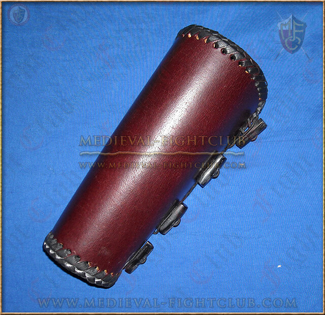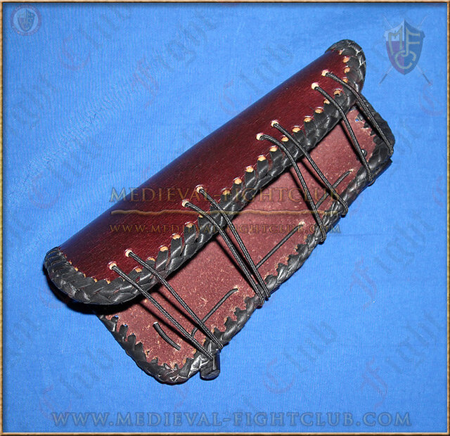 Leather arm guard for archery. This one has a very rugged, manly and traditional look which is edged in platted leather. Has toggle loops for easy fitting. Come supplied with cord. Designed to protect your arm from the string hitting your inner forearm, it can also double as suitable low cost leather armour on one arm.