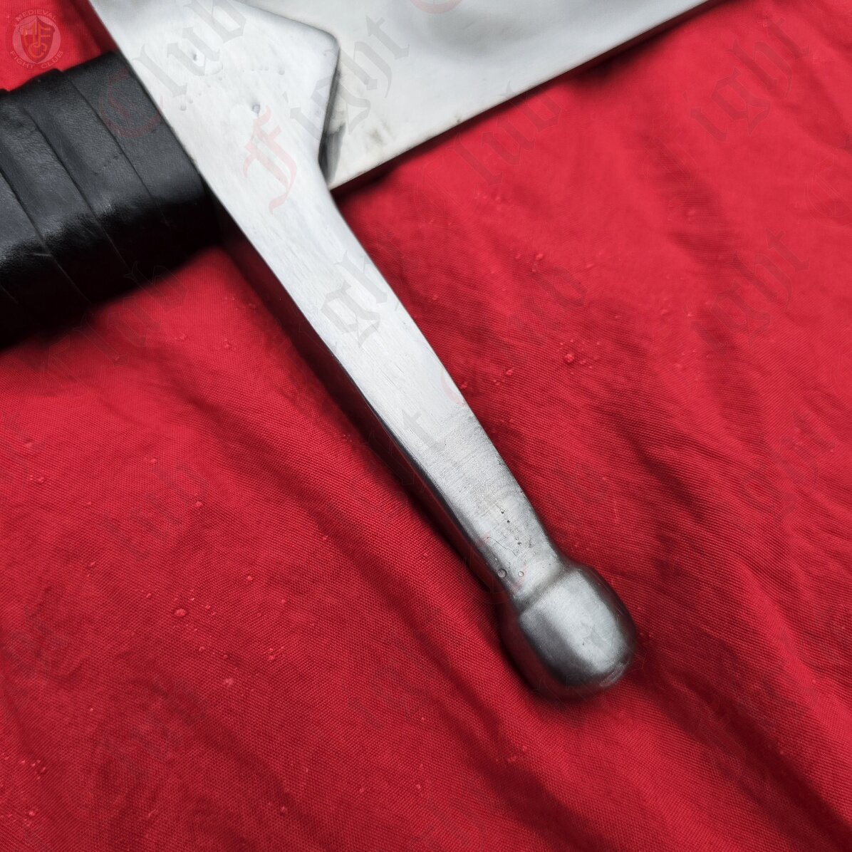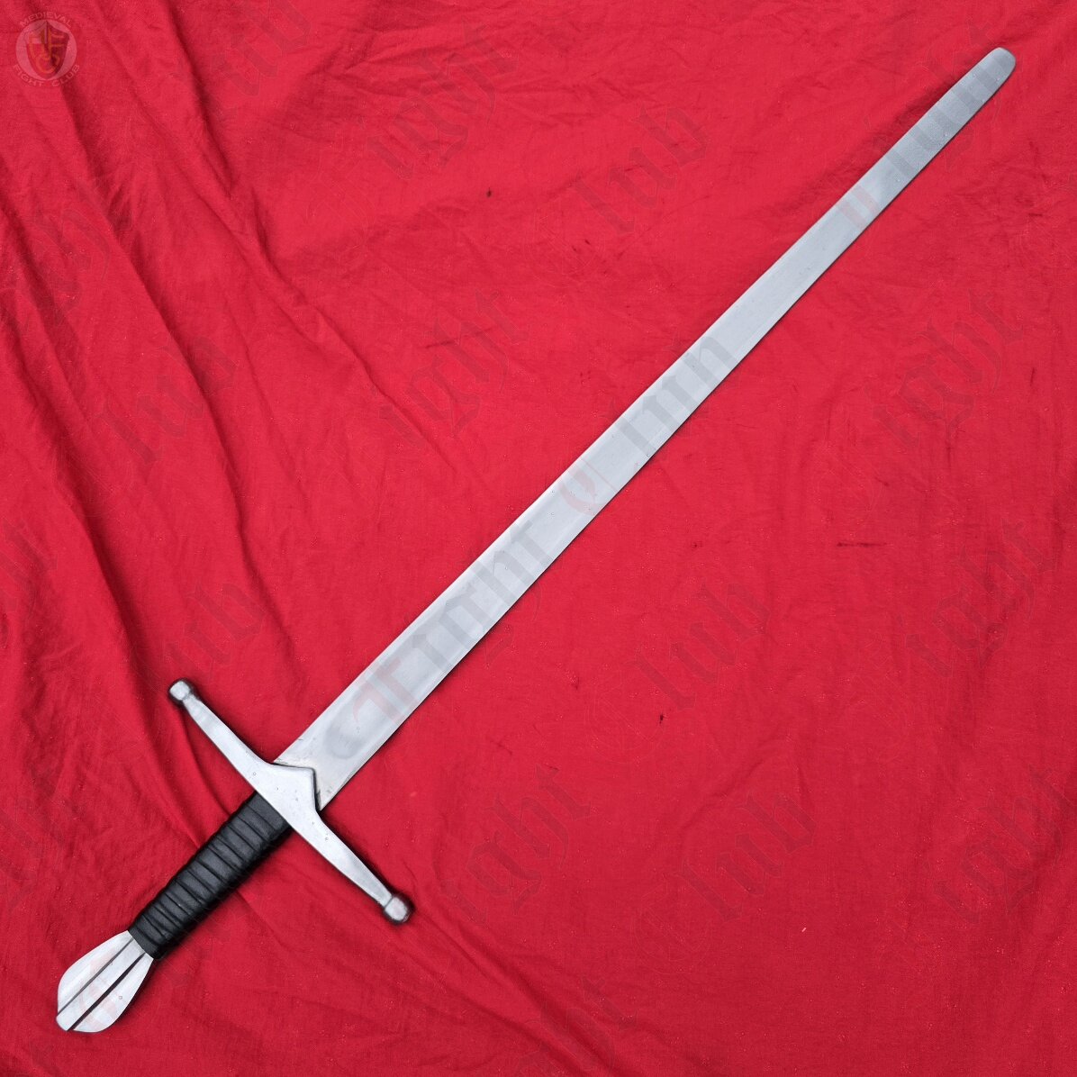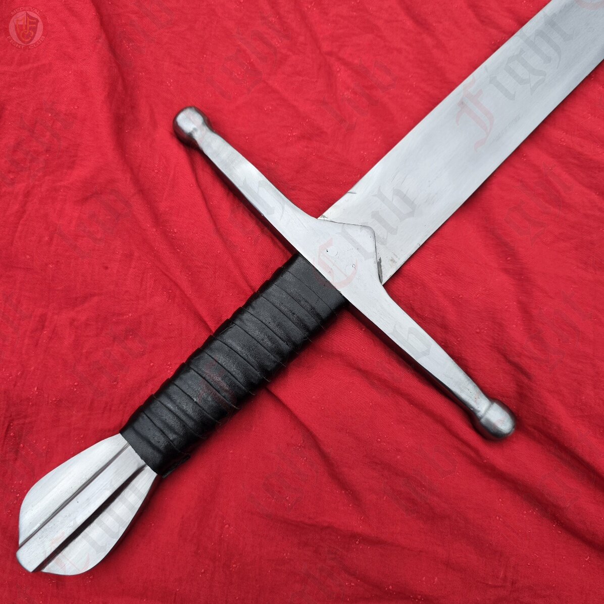 This particular sword features a straight cross guard with decorative knobs, as well as a faceted pear shaped pommel. The grip is leather bound for comfort, and the point is also rounded off according to re-enactment standards allowing you to use this sword in combat without modification needed.