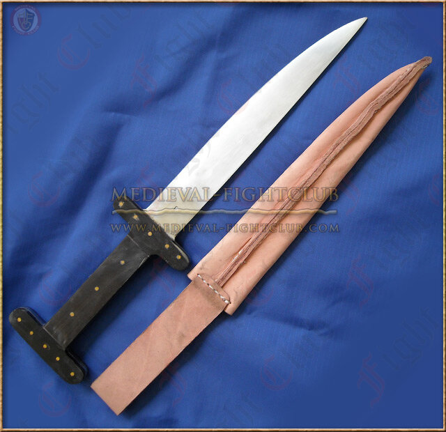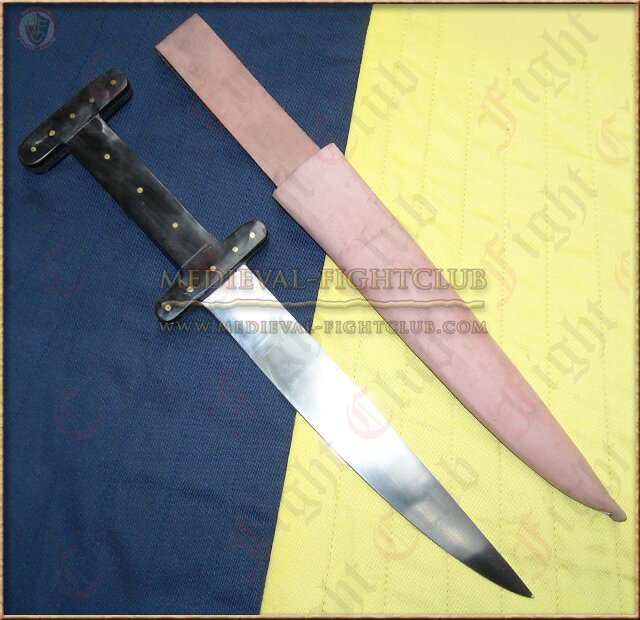 Both the term baselard and the large dagger with H-shaped hilt or "baselard proper" appear by the mid 14th century. Several 14th-century attestations from france gloss the term as coutel "knife". http://en.wikipedia.org/wiki/Baselard
