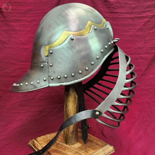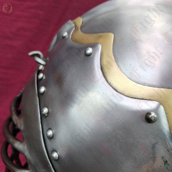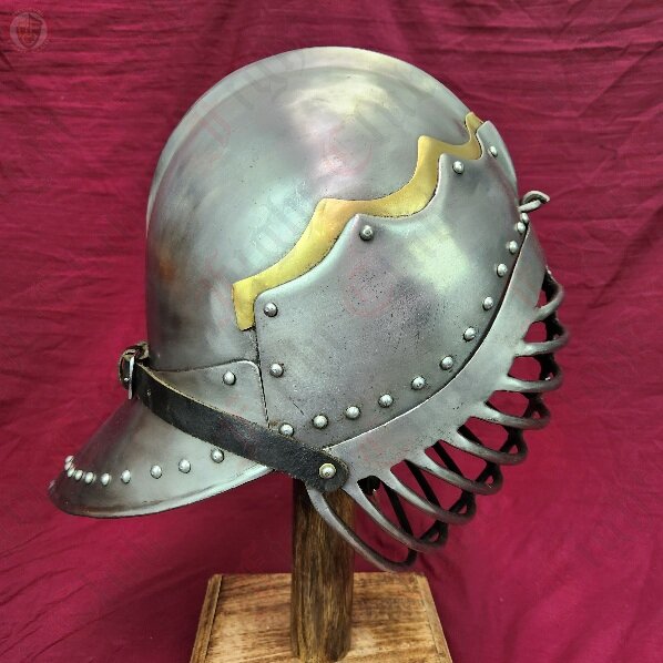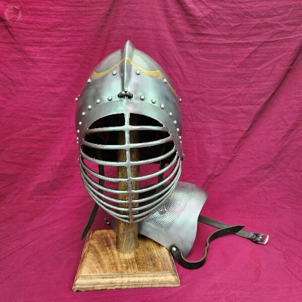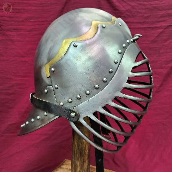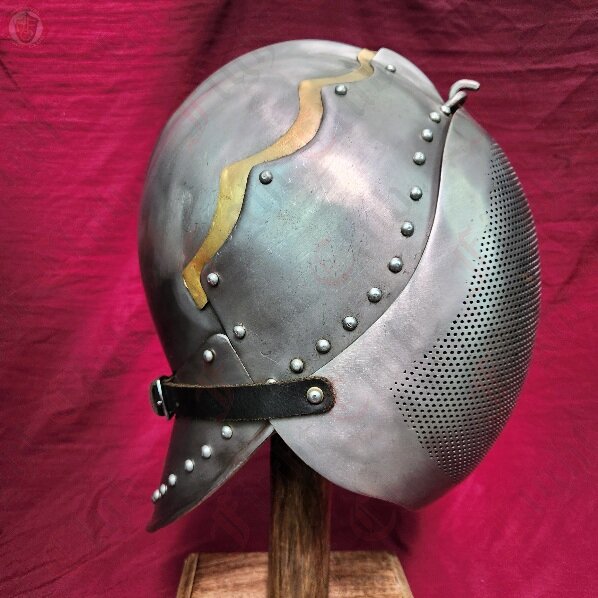 The sallet is a stape helmet from 15thC Europe, in particular Germany and Italy. This sallet is based off of a German style, denoted by the iconic flute at the back, and was basically the universal helmet of German soldiers in this period. This helmet features only a minimal flair: a brass layer above the crest. Not too much, but enough to show your distinguished side. This sallet also comes with two faceplates, a barred version for SCA combat and a steel mesh version for combat archery. Both hook into a slot at the forehead and are secured via a leather strap.