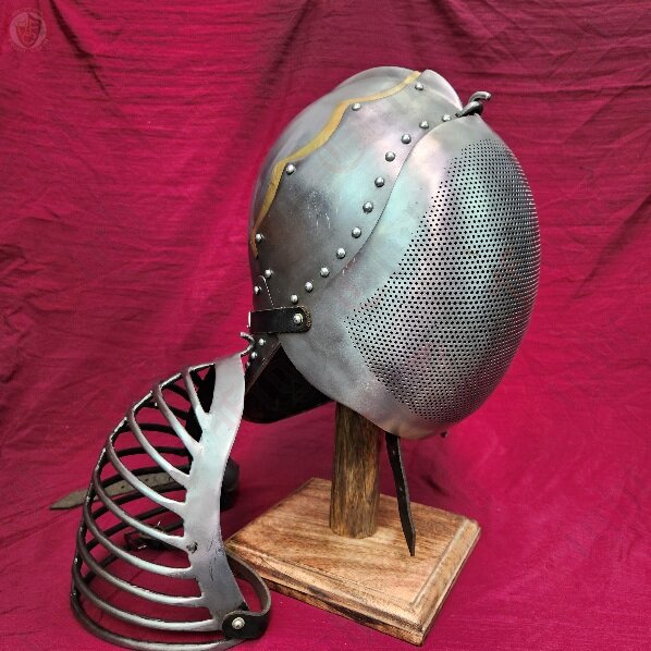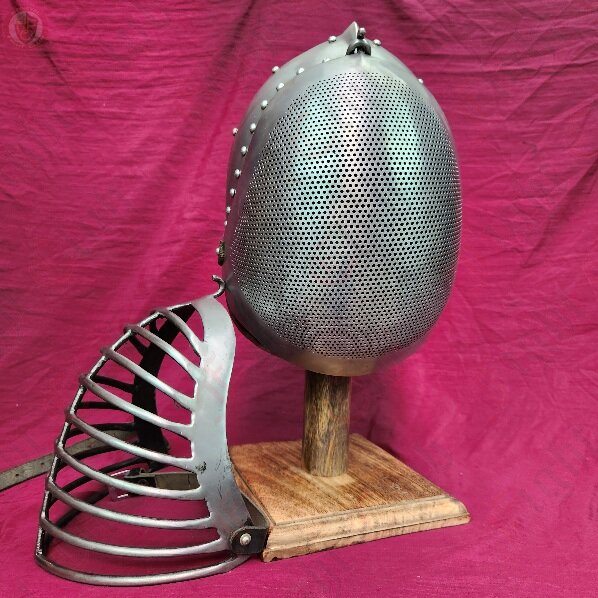 Bascinet helm with mesh faceplate for archery, also suitable for HEMA where you want an historical helmet.