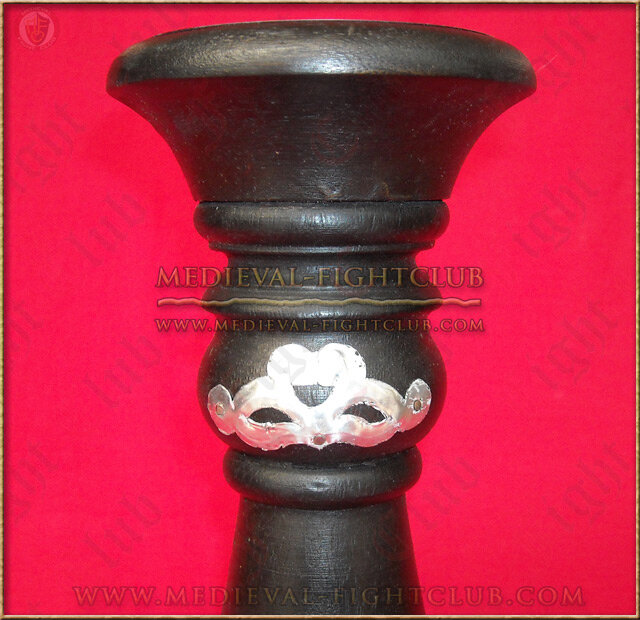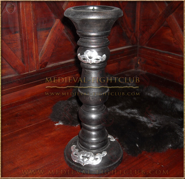 This candleholder is solid and tall. Carved from 100% wood, this candleholder has been painted black and adorned with a silver metal motif. It provides a stunning effect and candle light is reflected off the silver surfaces.