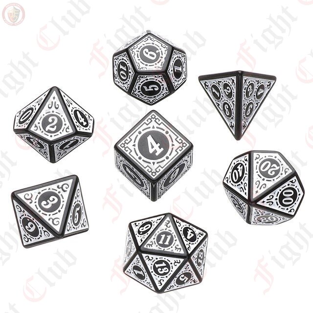 These dice are made of resin- easy to roll and hard to damage. They are a stark white with black embossed numbers. A colour scheme perfect for either a noble paladin or a gothic vampire.