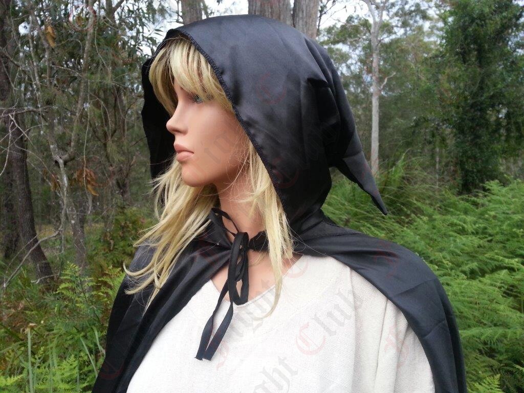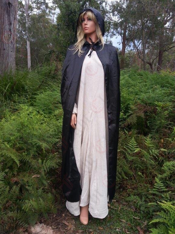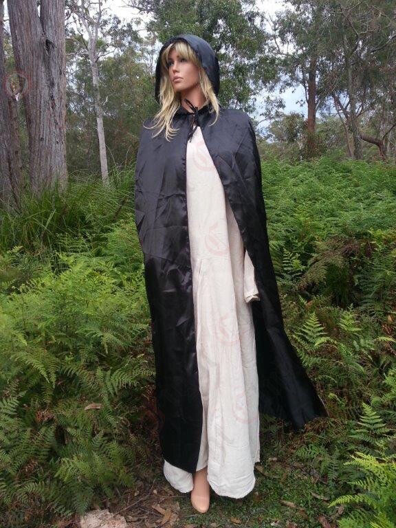 This is a long black imitation satin cloak with hood which will fit all men and women.