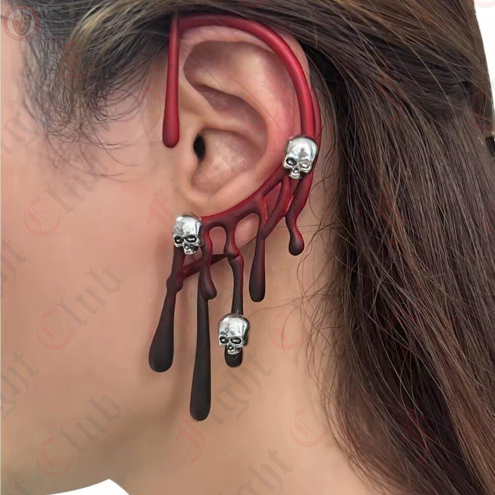 The bleeding skull ear cuffs are nothing if not dark, theatrical, and undeniably striking. These cuffs trace the natural curve of the ear with flowing, organic lines that mimic the look of fresh blood cascading downward in a gradient that shifts from bright red to a deep crimson.