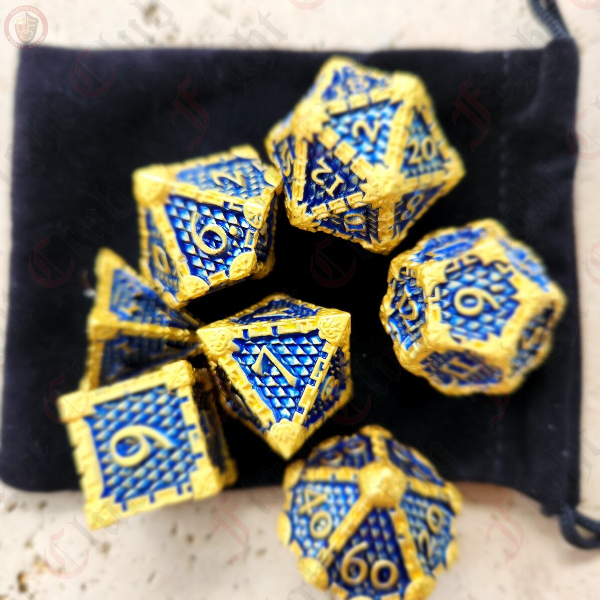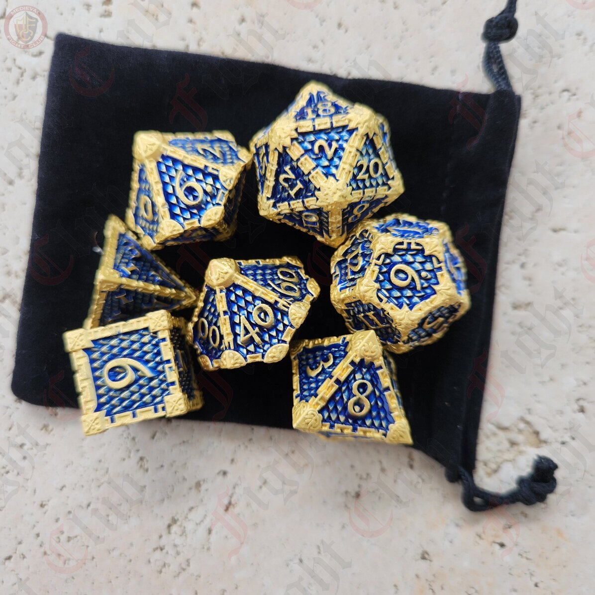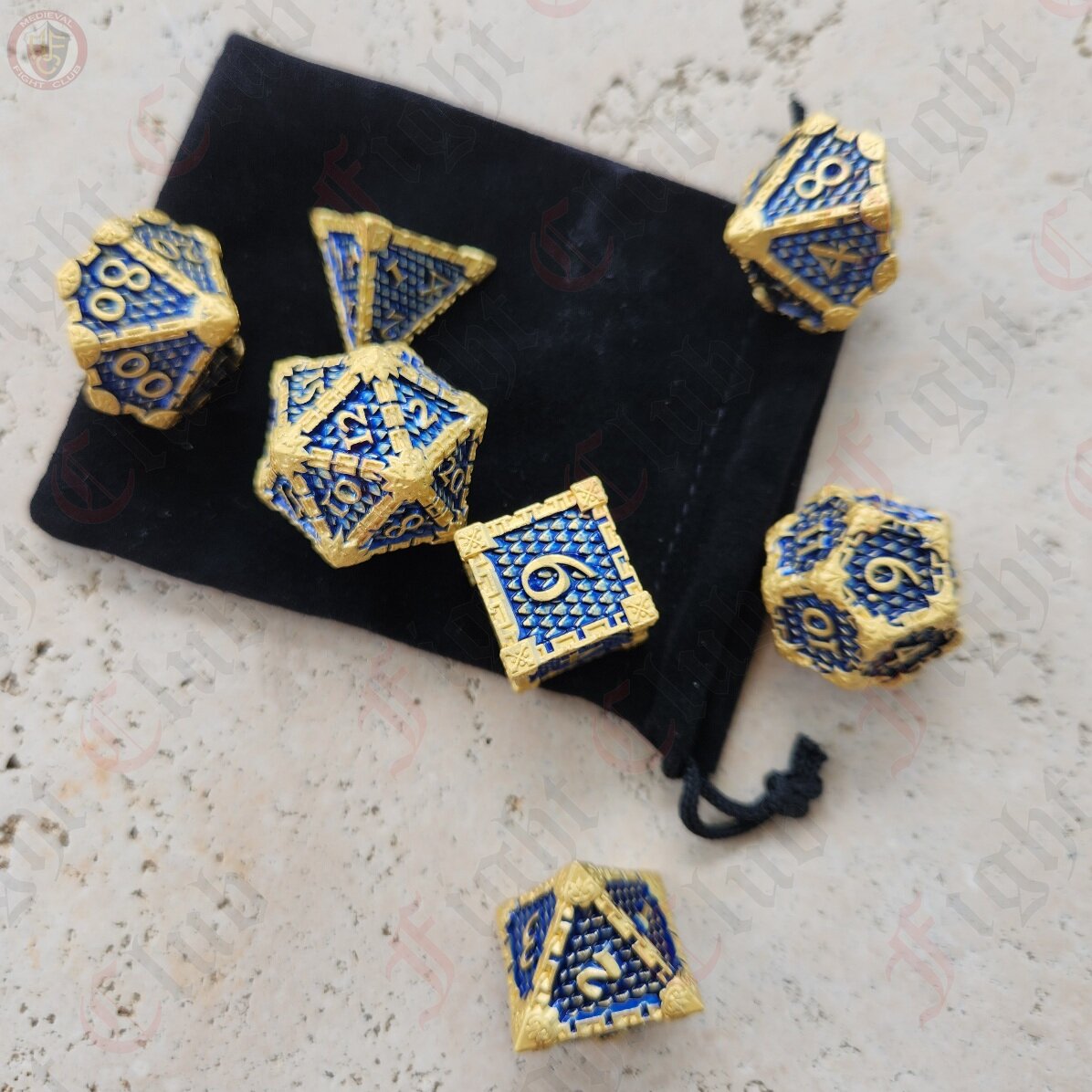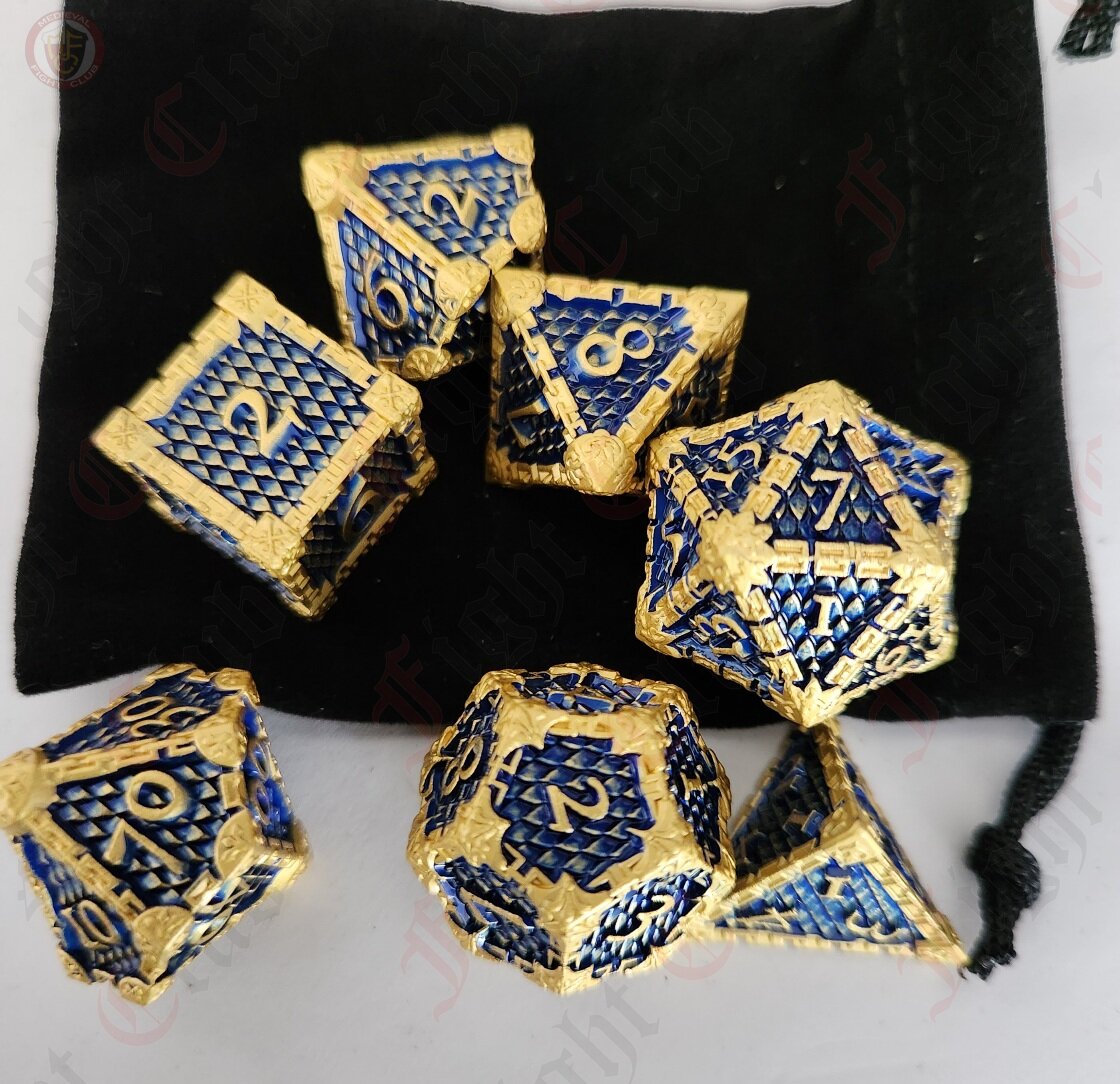 These blue and gold scale dice are certain to get noticed at your next gaming session! They also make a wonderful gift for that gamer in your life, whether they are a player or game master.