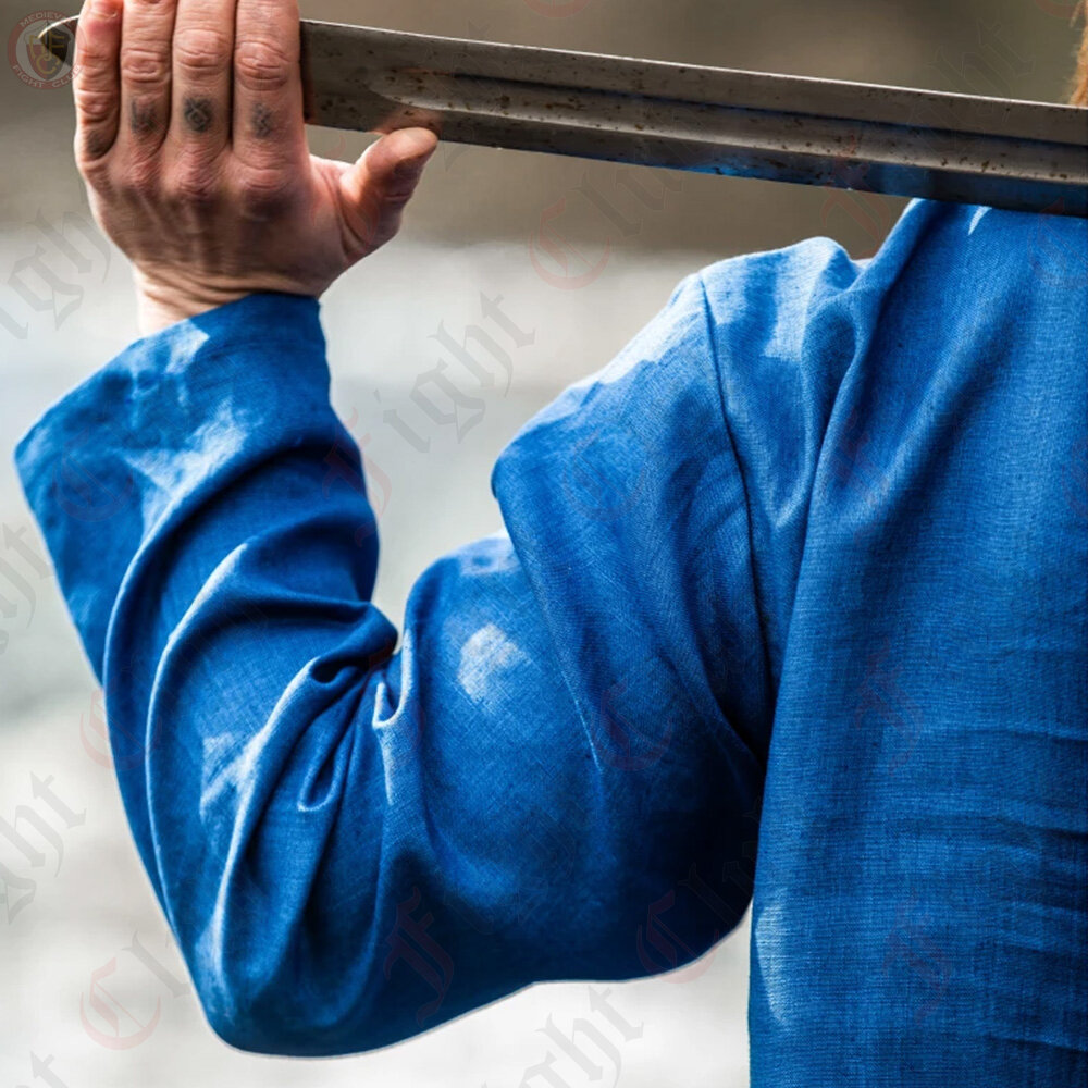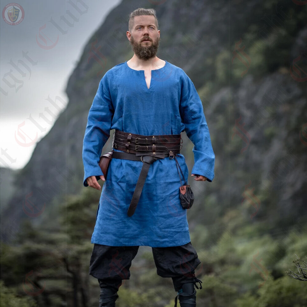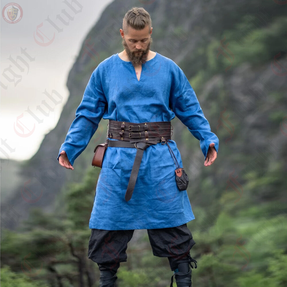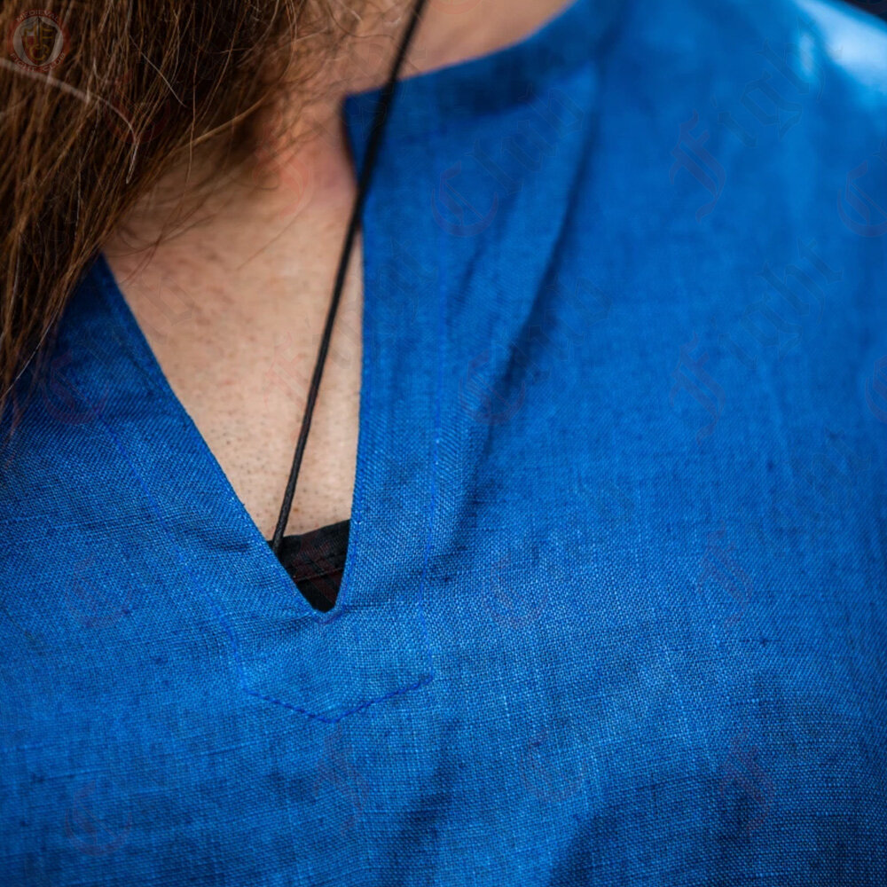 This Viking tunic is made of high quality 100% linen, which ensures high comfort and breath-ability. With its knee-length cut and side slits, it offers optimal freedom of movement and flexibility. It is perfect for LARP events, medieval markets or your next re-enactment event.