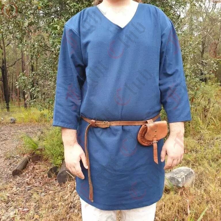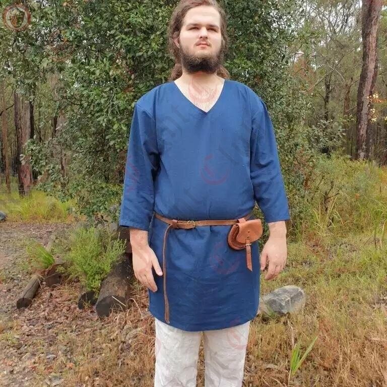 This tunic in particular is 100% cotton, dyed blue, and is a standard, simple design with 3/4 length sleeves and a v-collar neck. It suits many time periods. Perfect for a standalone tunic, or as an undergarment for cold weather. (or if you want to be stylish and two-toned, ooh get you).