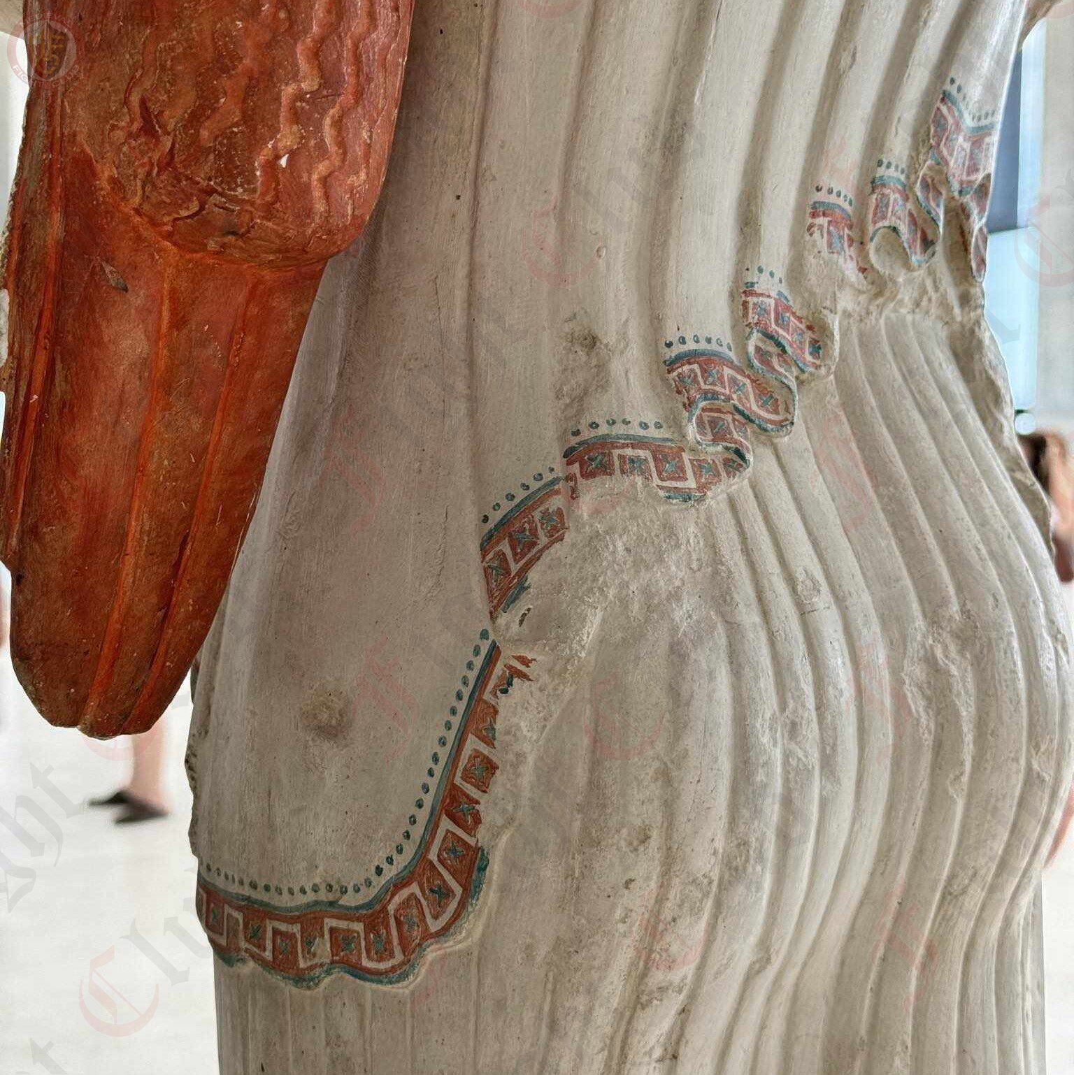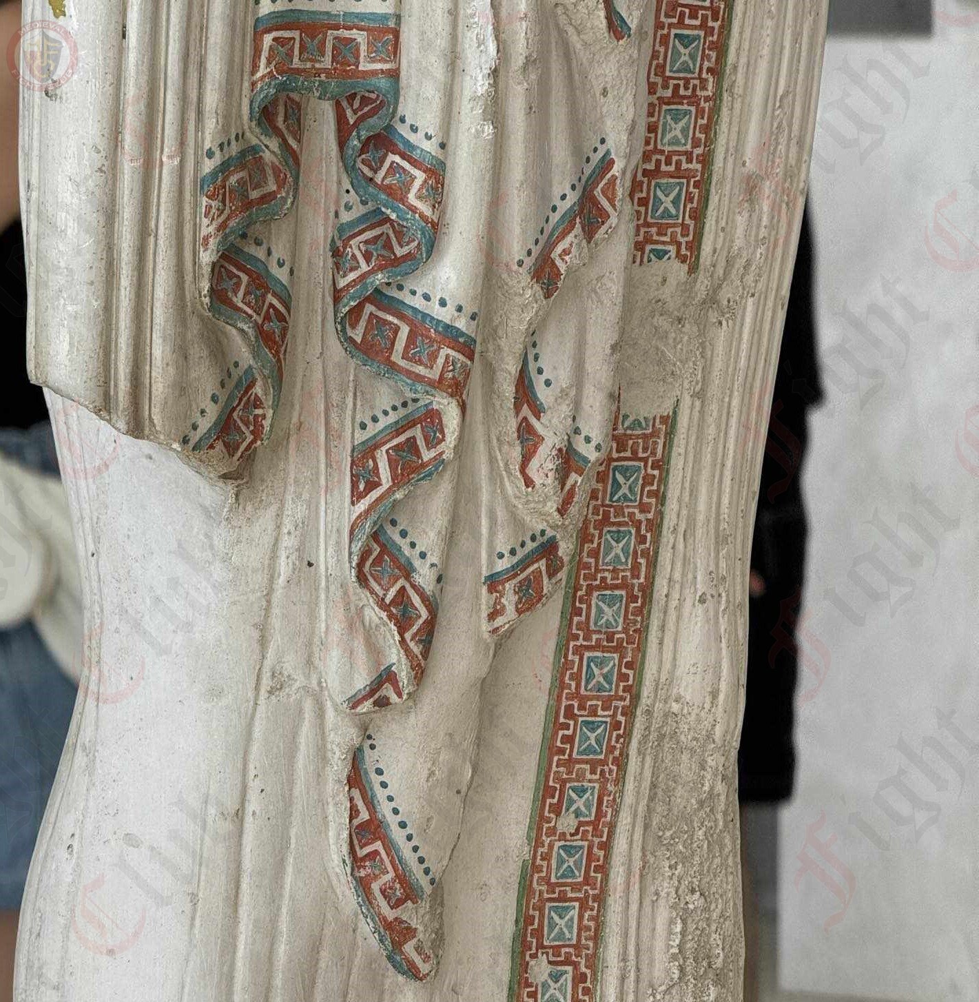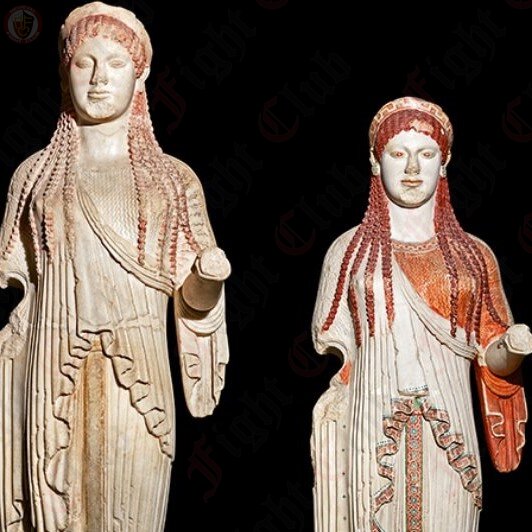It is based on a Kore sculpture in the Athens museum thought to be from 500~490 BCE and is known as the 'Acropolis 685'. The original (archaic) sculpture had paint that was studied and colour paintings were made over 100 years ago when the discovery was still new, a copy of the statue was also made and painted. The Korai of the Acropolis of Athens are a group of female statues discovered in the Perserschutt of the Acropolis of Athens.