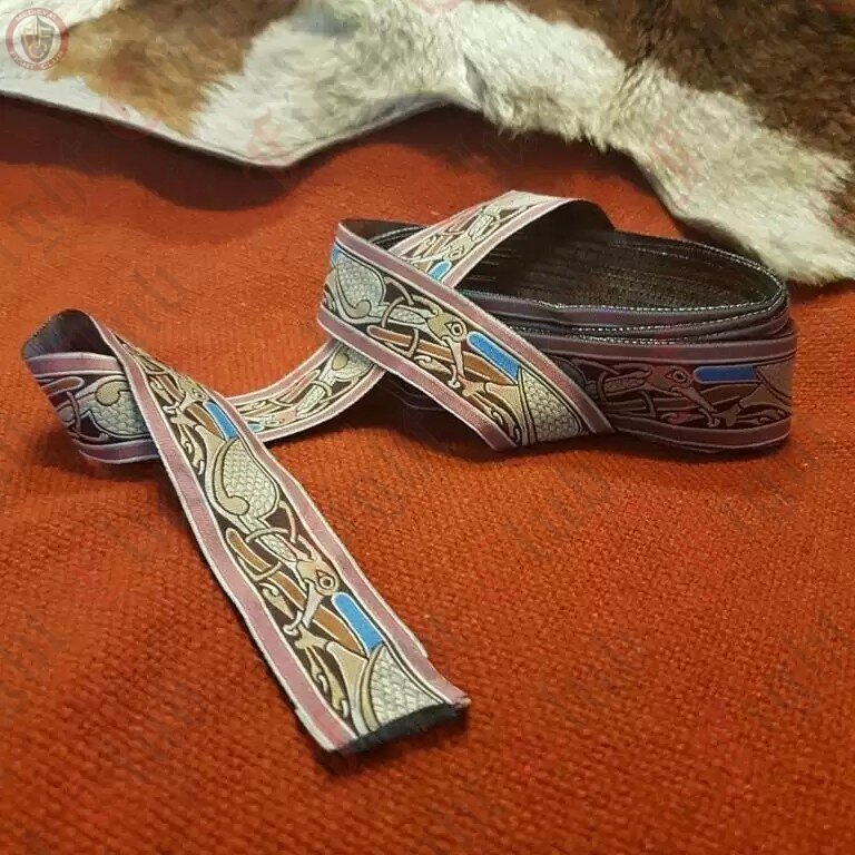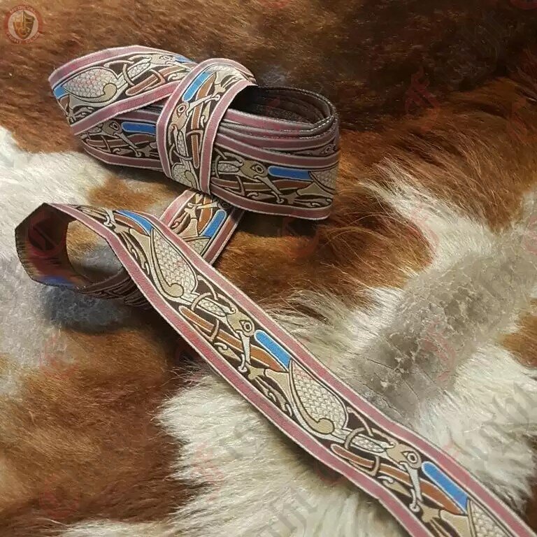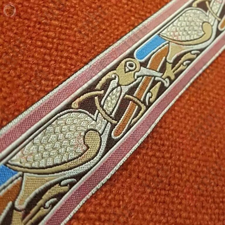 Add a striking, historically inspired detail to your Viking or Saxon costume with this woven braid featuring an endless Bird of Prey motif. Rendered in muted shades of brown, dusky rose, and blue, the design is both subtle and highly detailed once stitched onto garments. Developed exclusively by Fight Club, this braid is unique to our collection and cannot be found elsewhere.