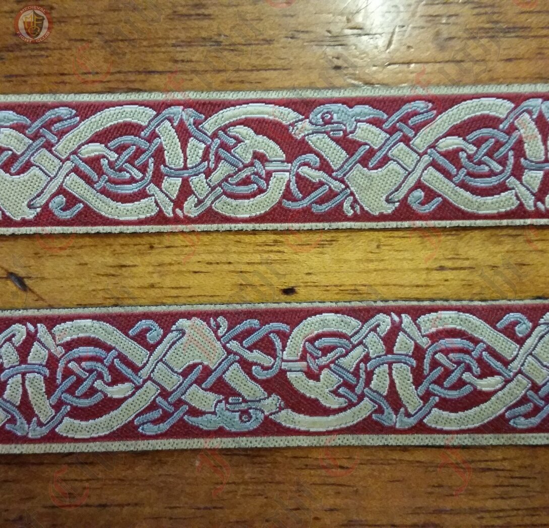 Enhance your garments with this striking Norse endless dog weave braid. Woven in earthy tones of red, yellow and light brown, the 24 mm wide trim features an interlaced “dog” motif repeating infinitely — a design rooted in Viking-era decorative traditions.