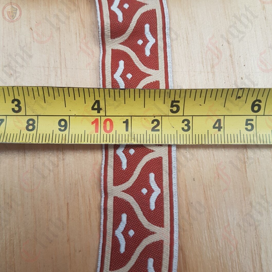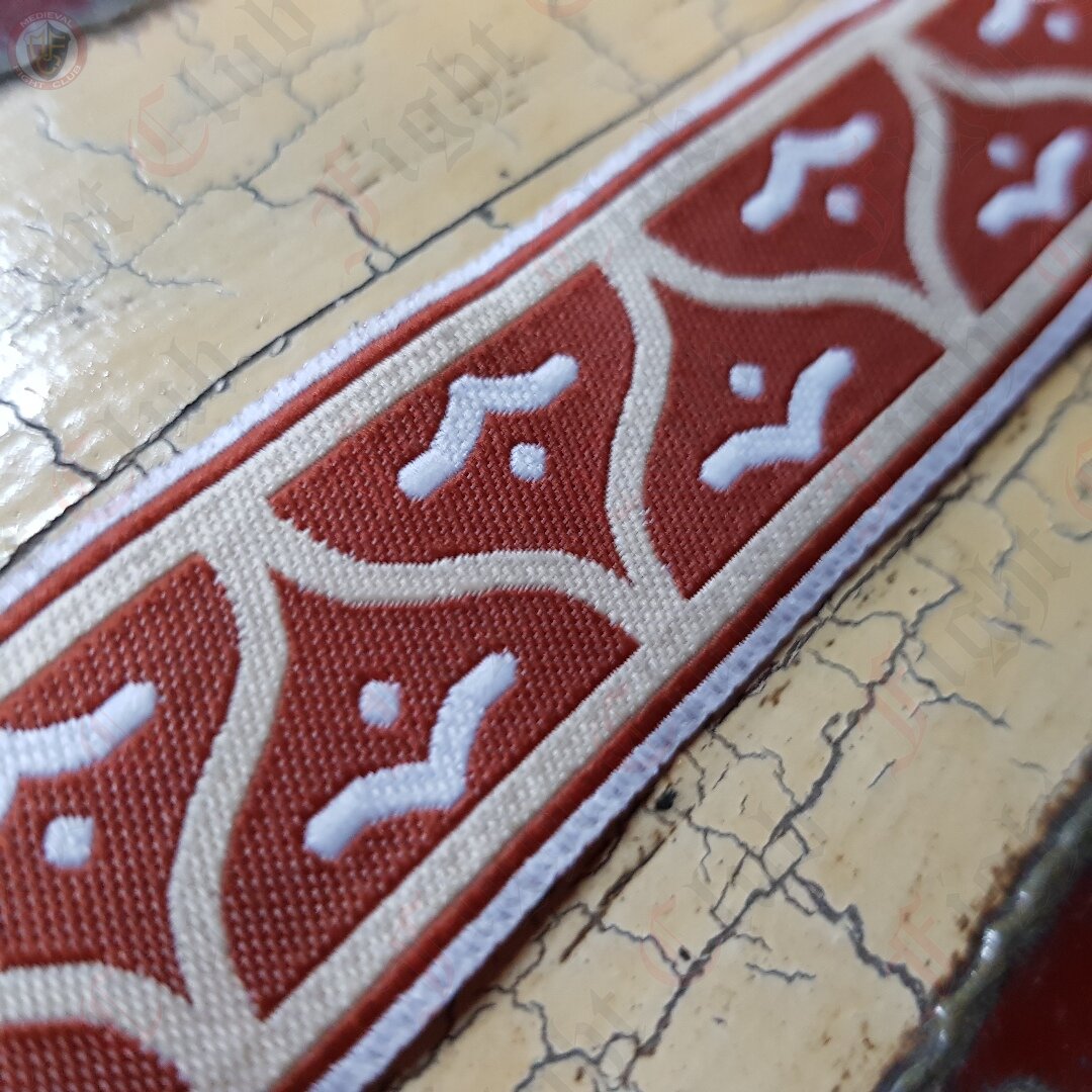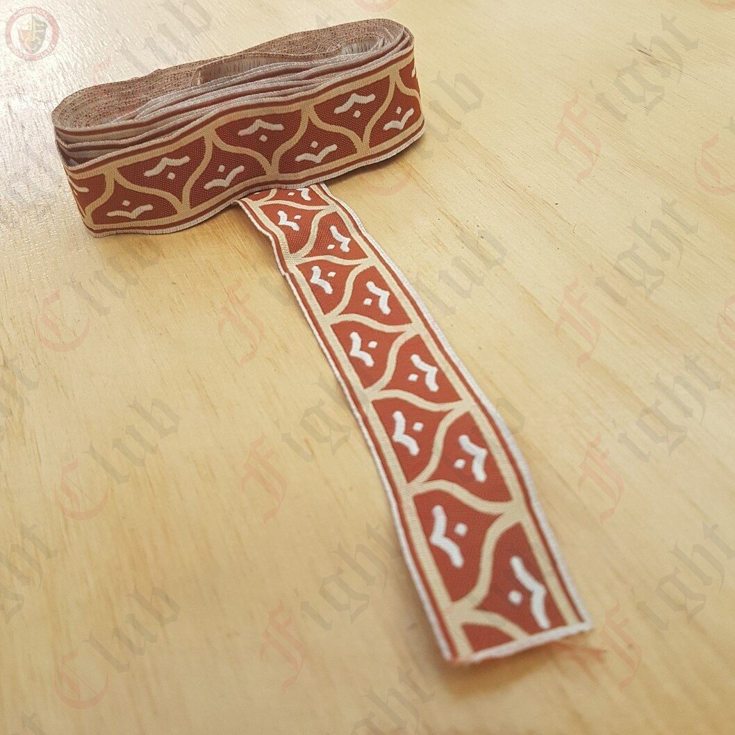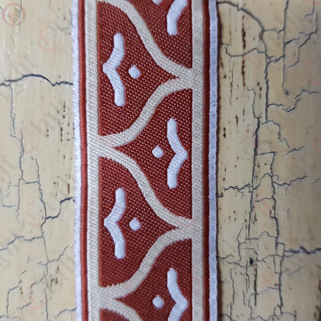 Woven braid with a design inspired by the formerly lost city of Pompeii. It features an endless repeating pattern in white and cream on a background of rusty red. A near identical pattern also exists at Herculaneum, only it is reversed colour.