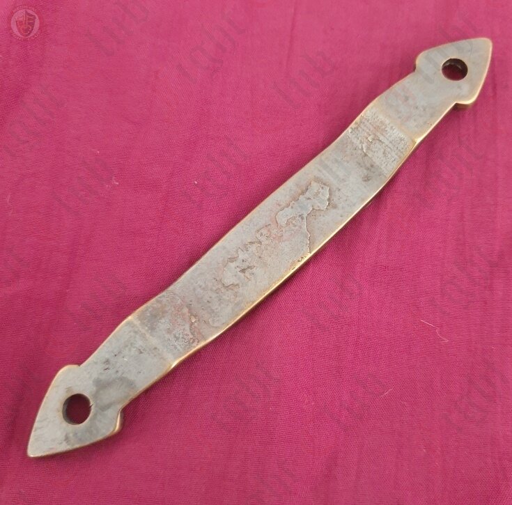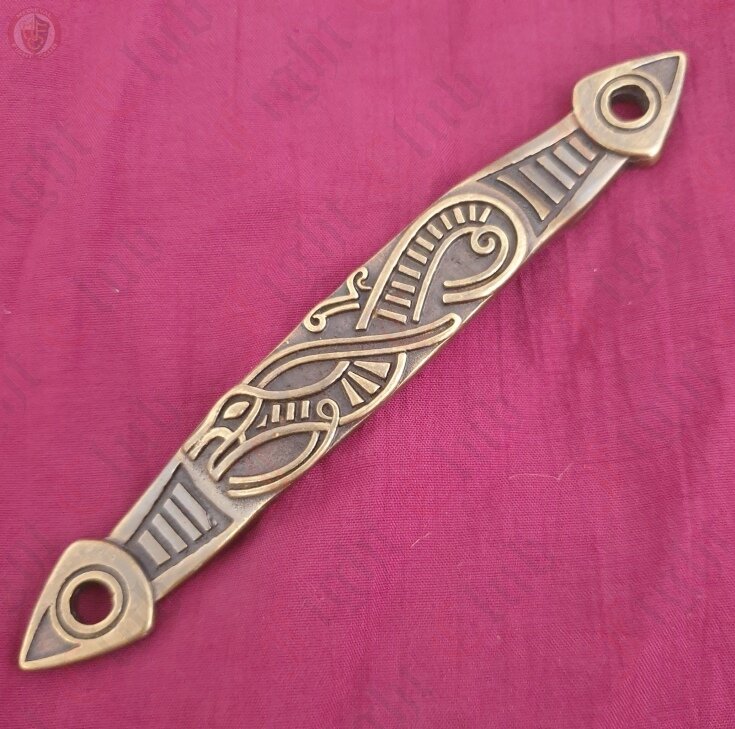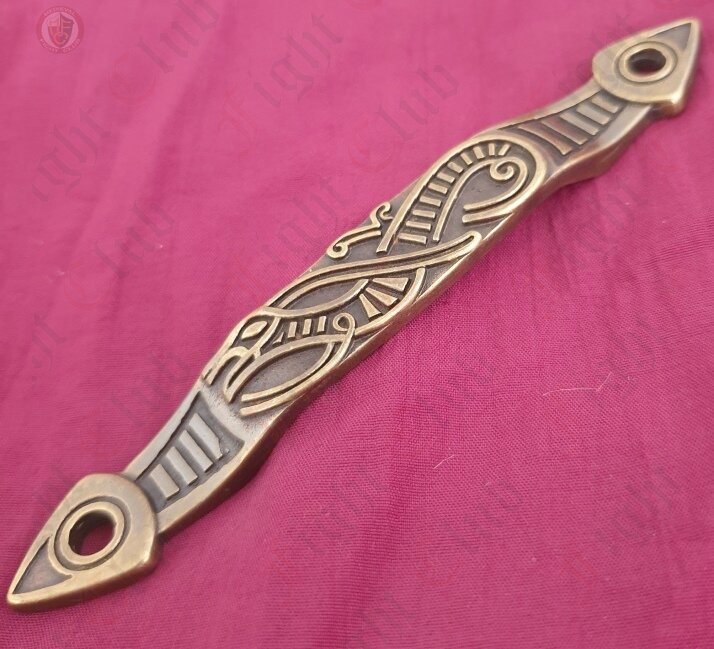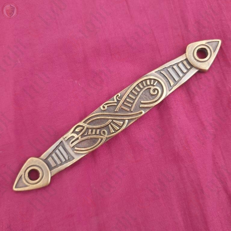 An amazing piece of craftsmanship, this beautiful brass scabbard hook displays the imposing image of a norse viking bird in flight. It's swirling patterns are indicative of early viking and Celtic designs, which makes it perfect for adorning your early medieval scabbard, to impress your friends... and your enemies.