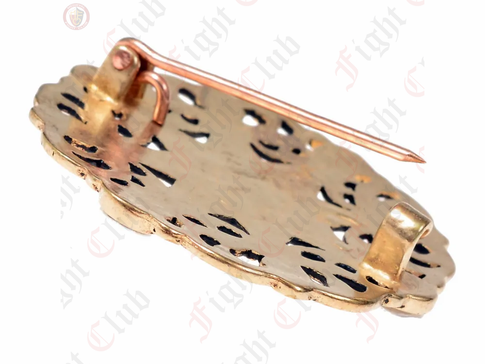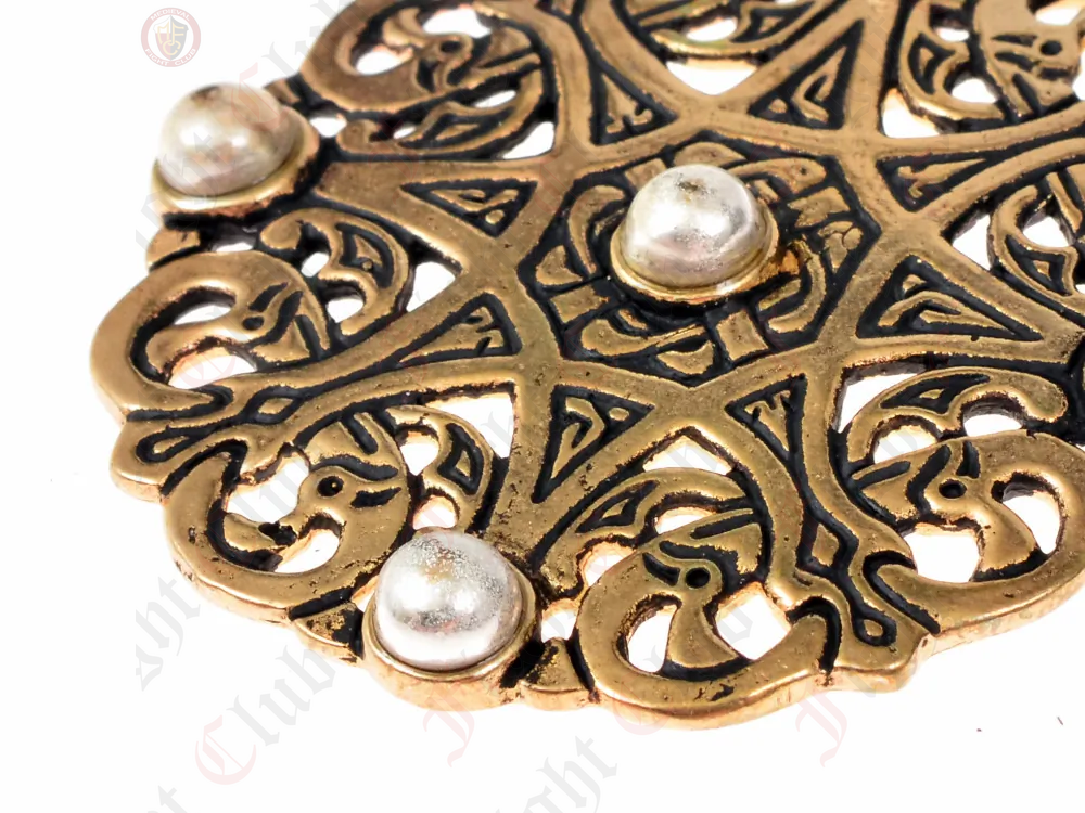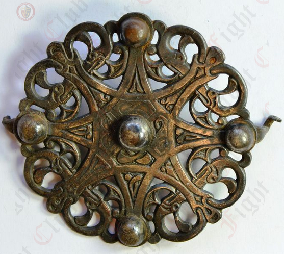 A remarkable disc brooch replica of an Anglo-Saxon find from the early Middle Ages. This Anglo-Saxon disc brooch belongs to a group of early medieval brooches of the 9th century, which are characterized by their openwork, cross-shaped form in the Trewhiddle style and are called the Elmsett type. The original disc brooch is now in the possession of the British Museum.