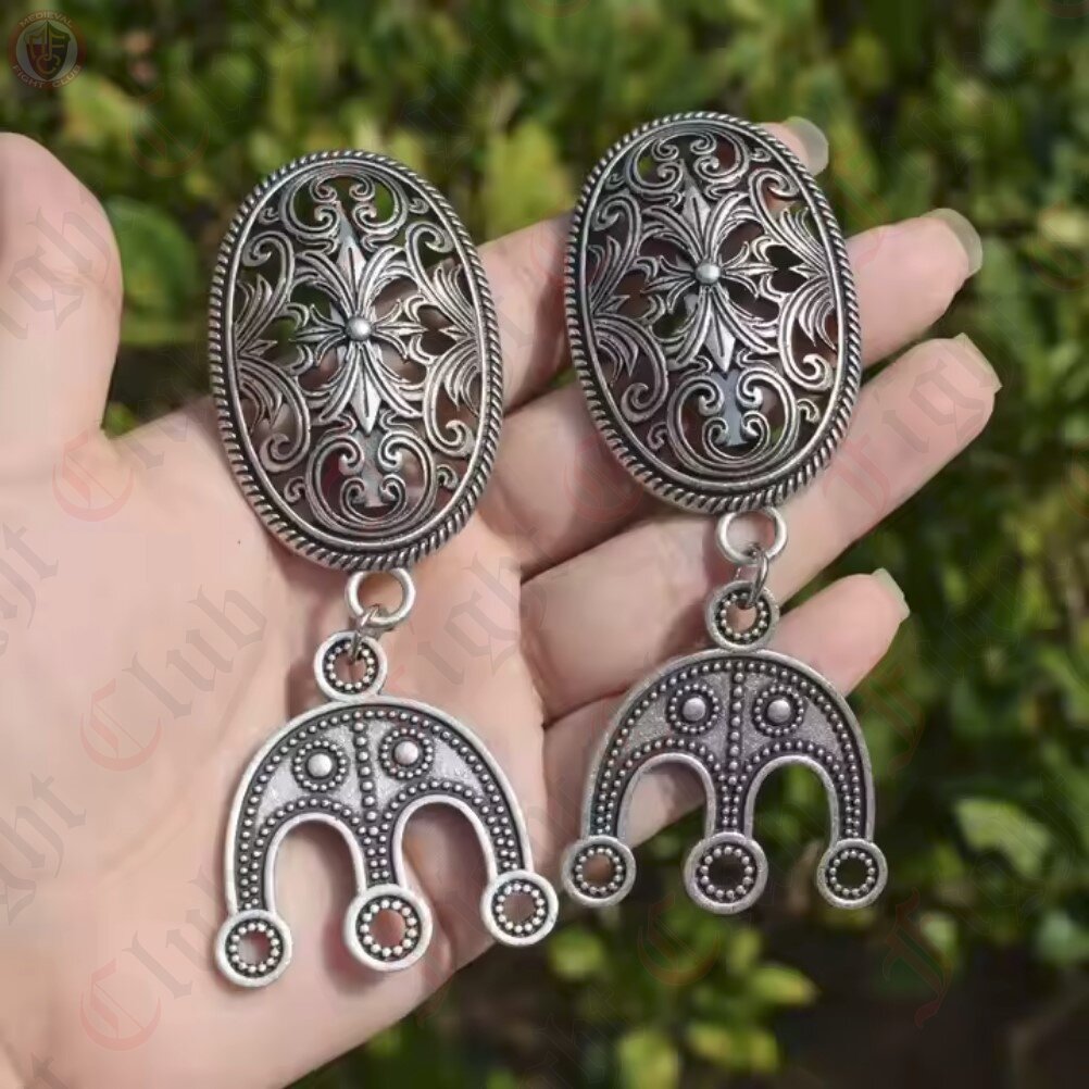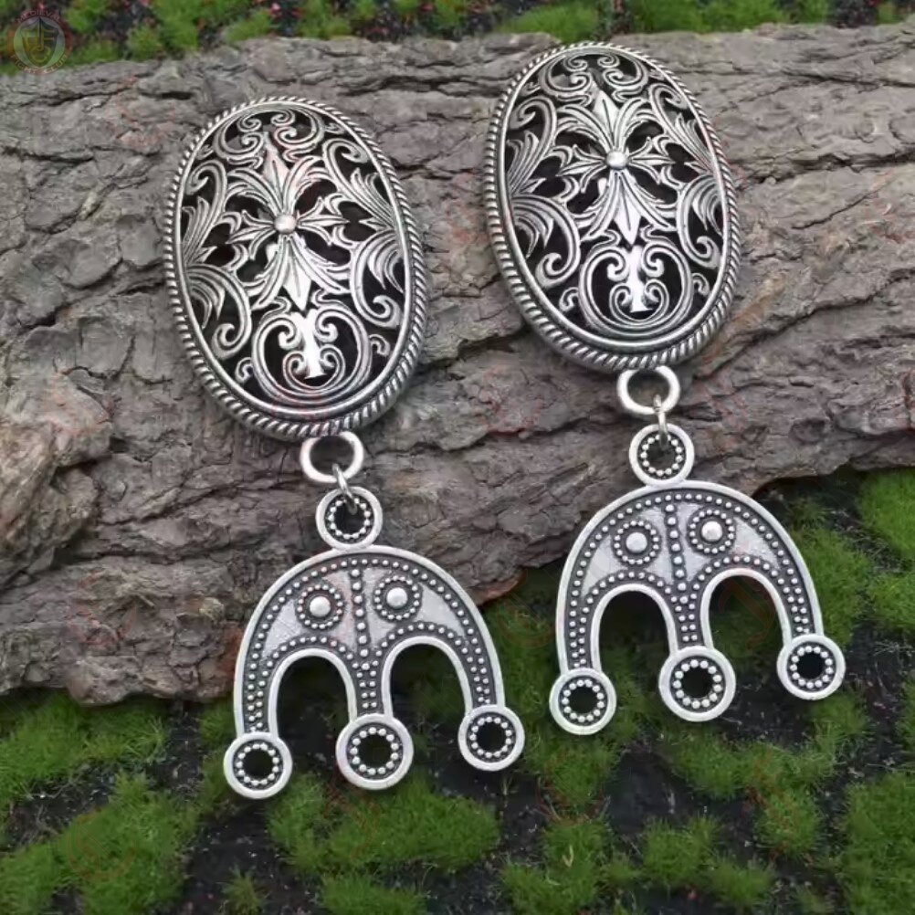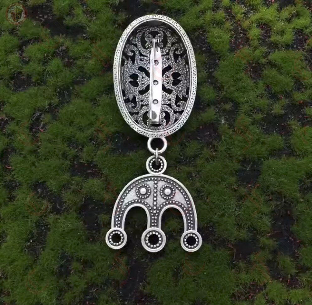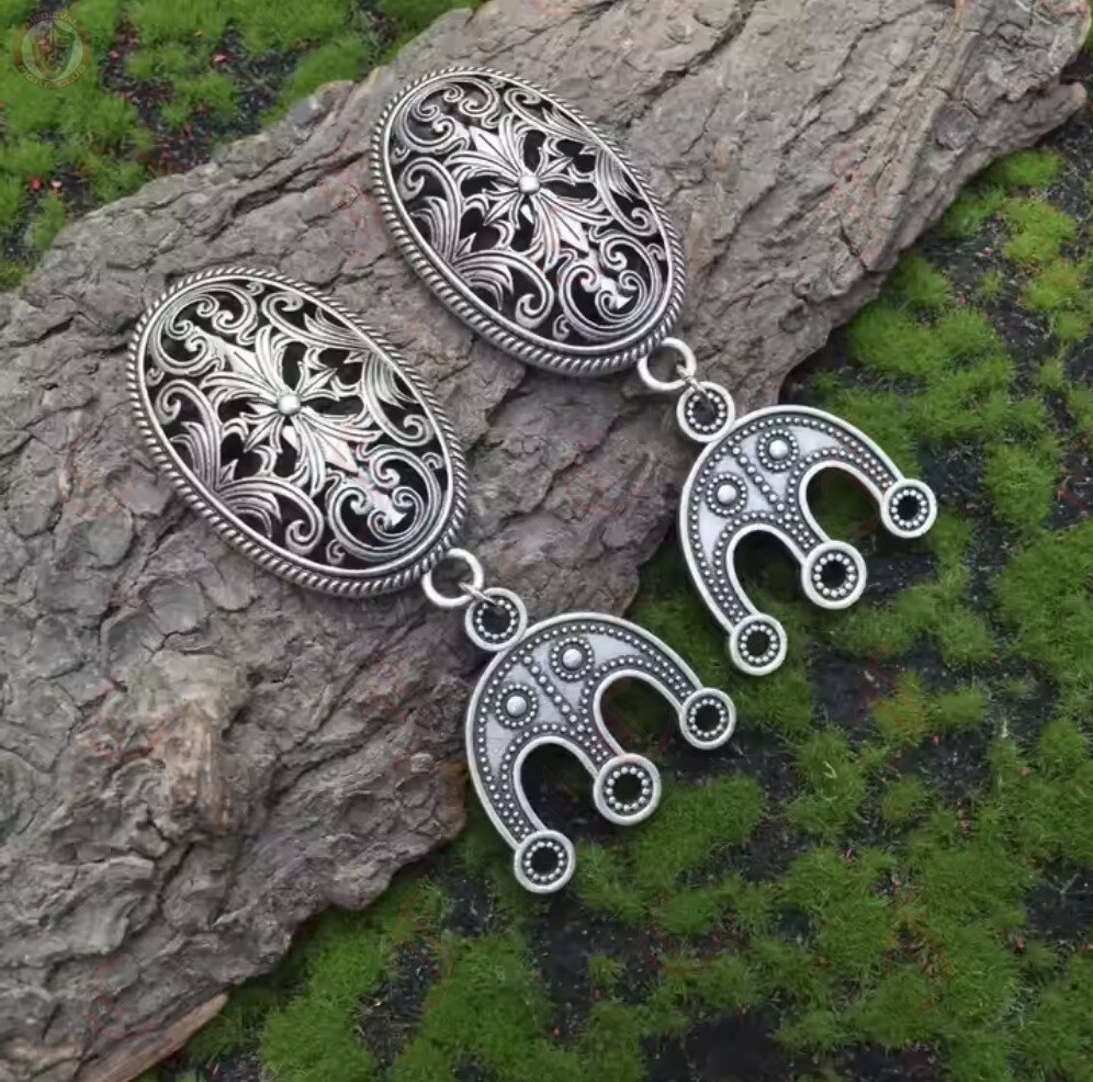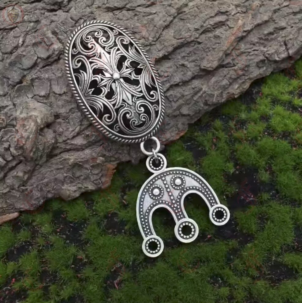 Viking oval brooches with curving floral design, with accompanying bead separators attached. Pin the brooches on either side of your chest and thread up to three strands of beads between the separators to show off your style, fashion, and wealth.