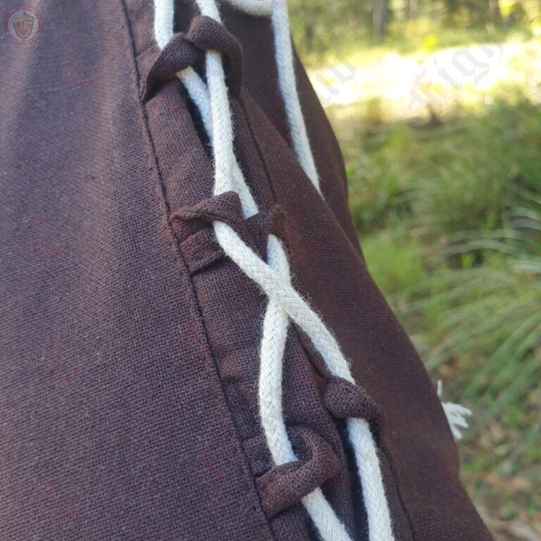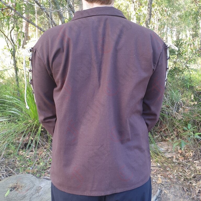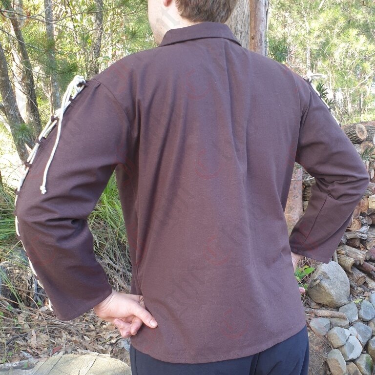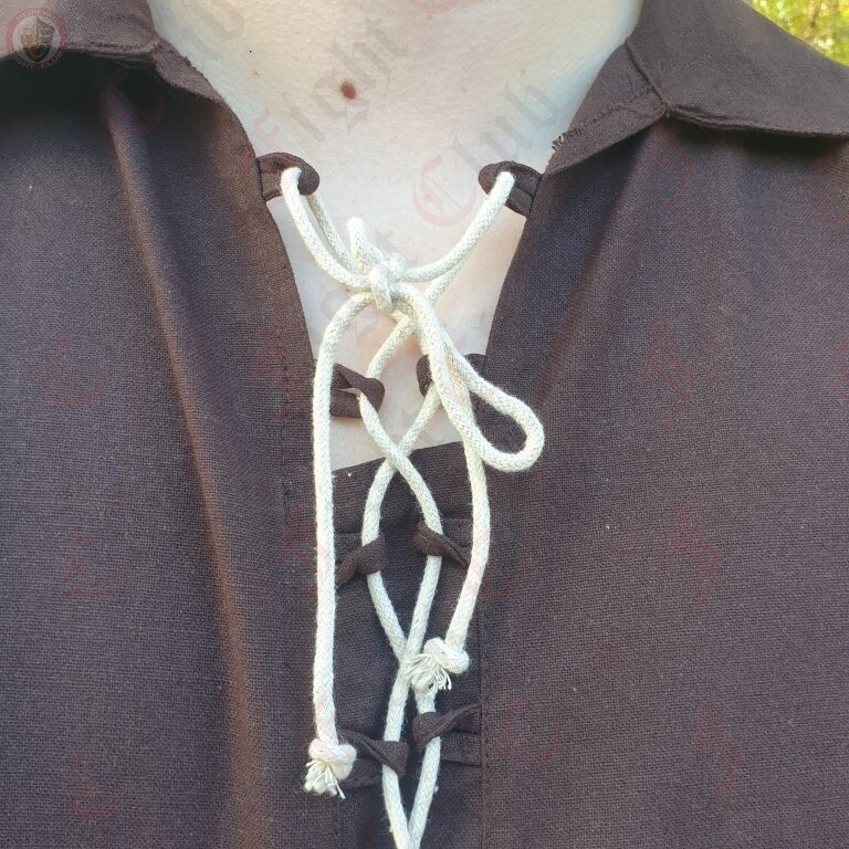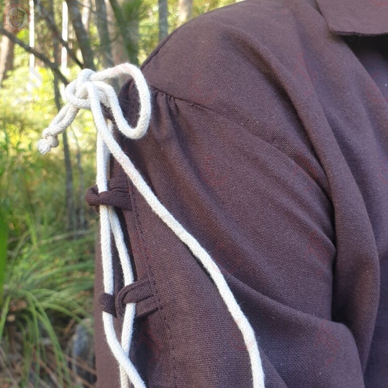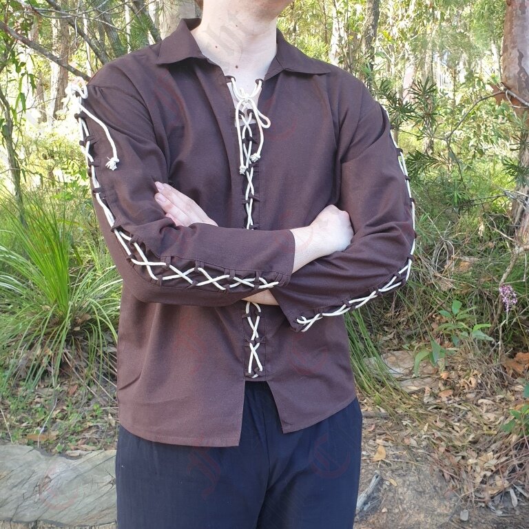 This tunic is made from 100% cotton. It is a simple shirt with full sleeves, a collar and decorative cream lacing along the arms and torso. It is best suited for a medieval look.