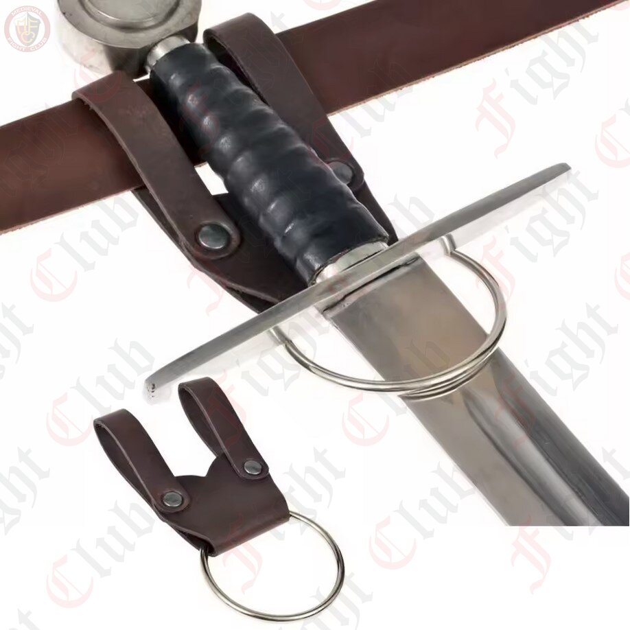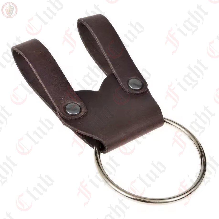 A weapon is only worth anything if you can hang it from your hip, and that's exactly what this leather ring frog lets you do! Simply thread it through your belt, slide it next to your hip, and slip your weapon down the ring. The ring will catch the crossguard of a sword or the beard of an axe, letting you holster most weapons with ease.