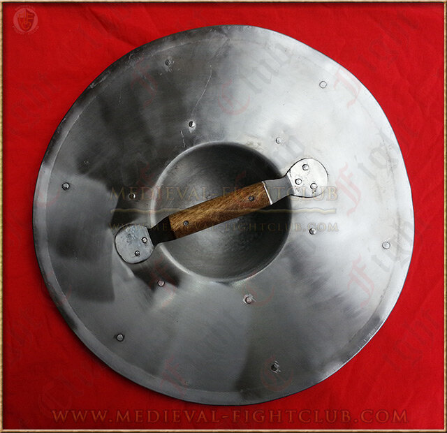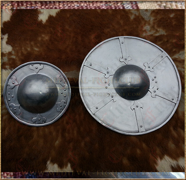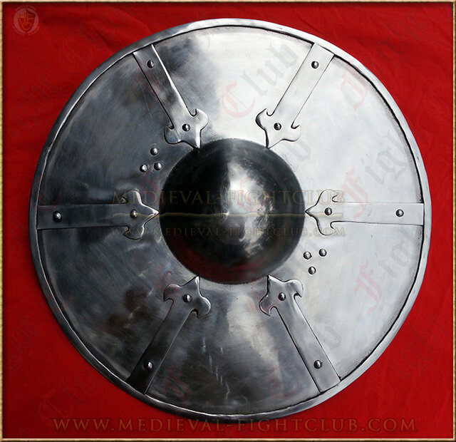 A buckler is a small shield that is gripped in the fist. This on features six Fleur de Lys pointing inward on the shield. Although strictly speaking this is a buckler, it is almost large enough to be a small shield.