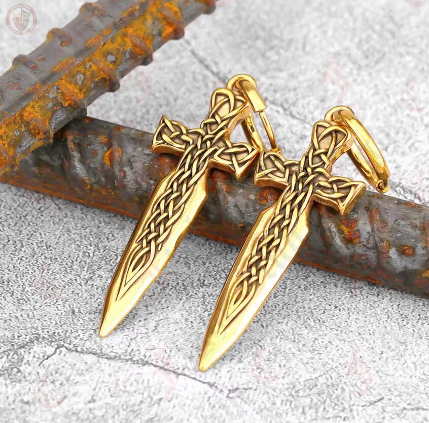 Add an edge of mystique to your look with these gold-coloured dagger sleeper earrings. Featuring intricate Celtic knotwork etched into the blade, they blend ancient symbolism with bold modern style. Lightweight and secure, they're perfect for everyday wear or making a statement at your next event. Channel your inner warrior with a touch of elegance.