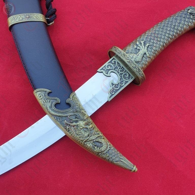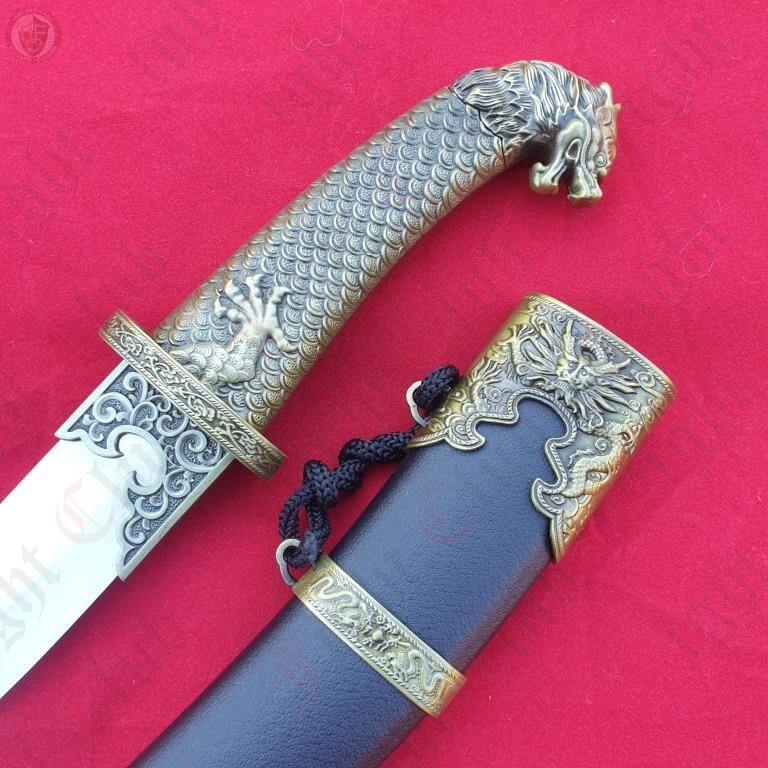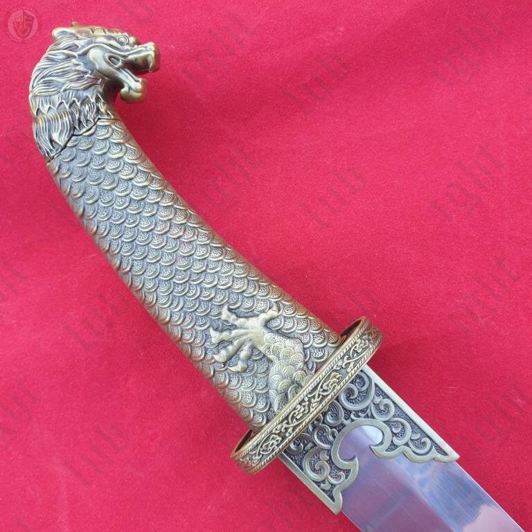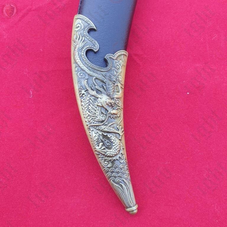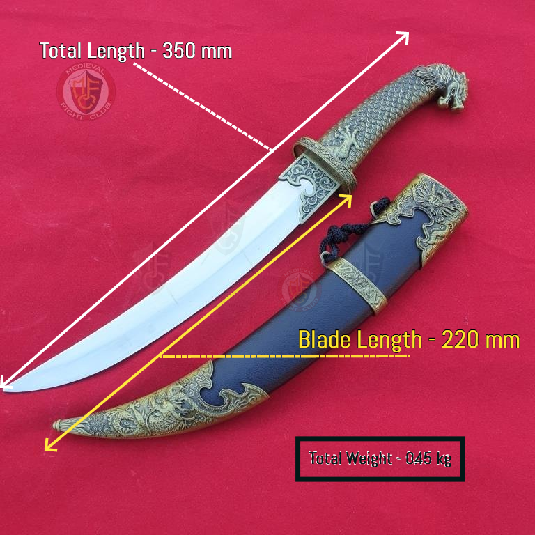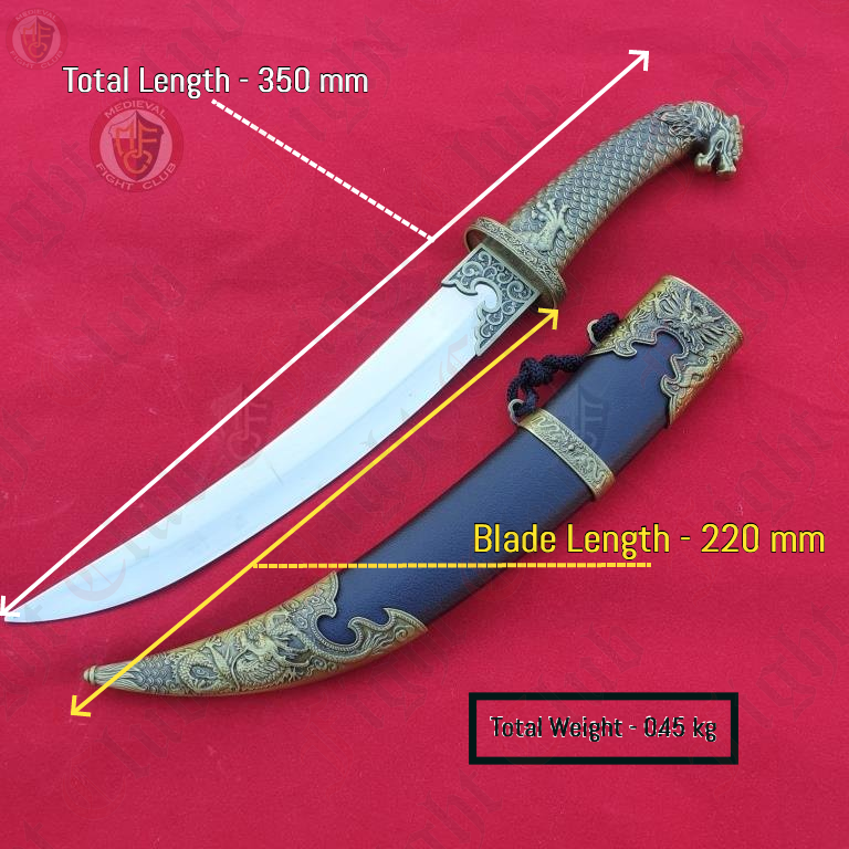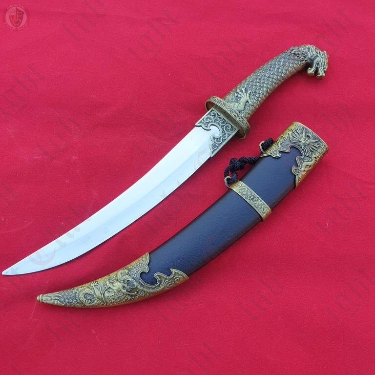 This curved dagger features the dragon head and neck scales on the grip.