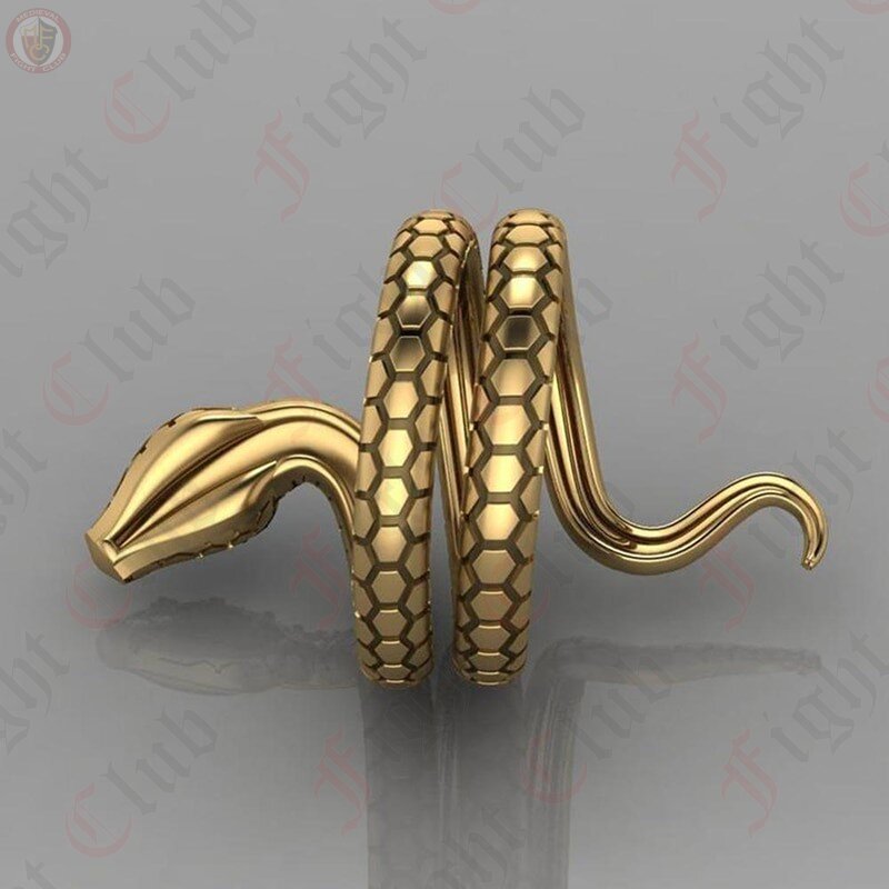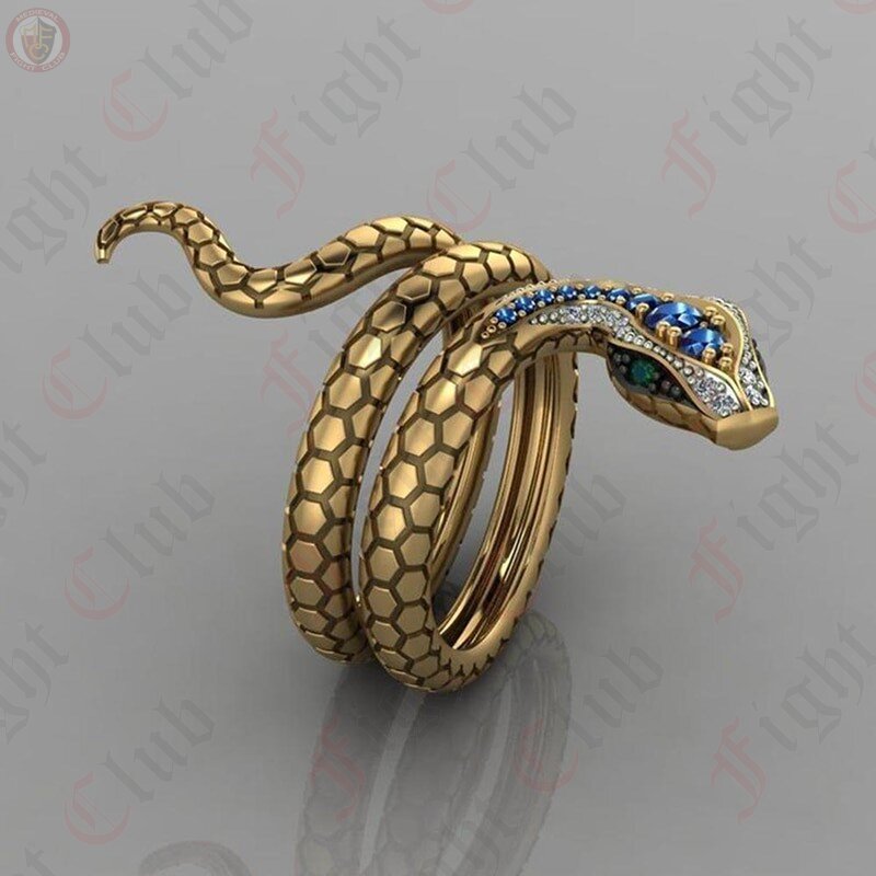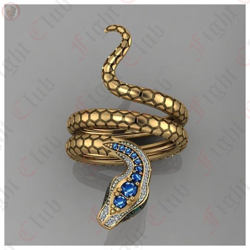 A beautiful golden coloured ring featuring a coiled snake with faux sapphire gem implanted in its head. The perfect roleplaying accessory for either a flagrant and flamboyant villain, or perhaps simply just a reptile enthusiast.