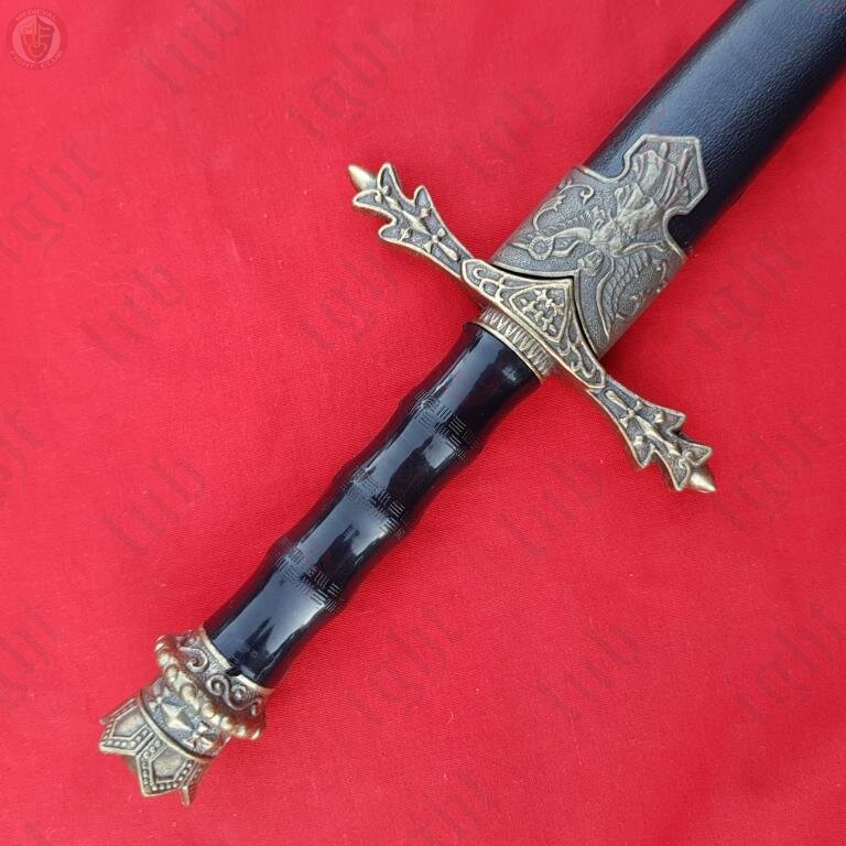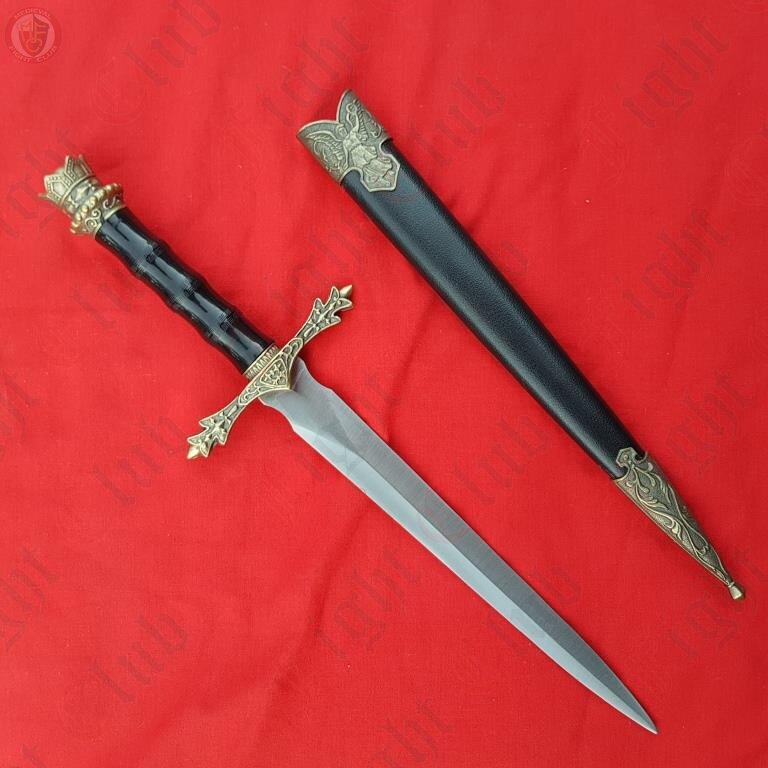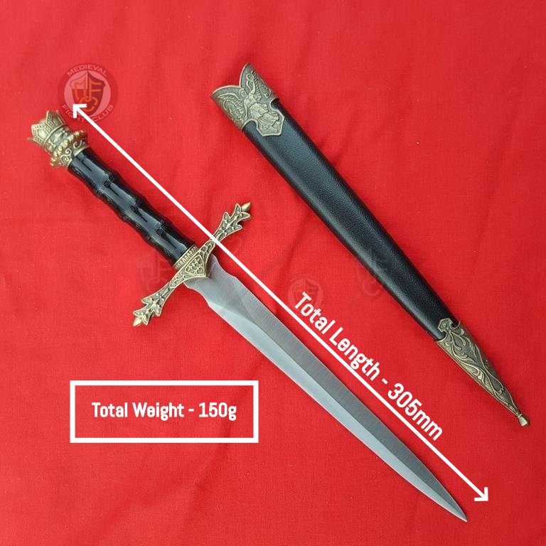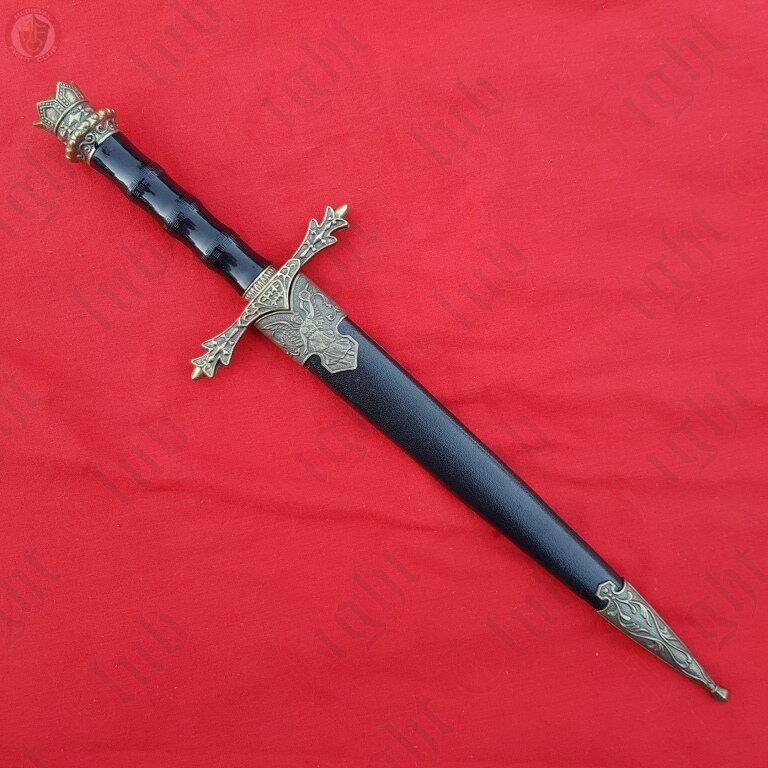 This dagger features a crown pommel  and ornate hilt. The scabbard depicts an angel hoding a wreath aloft.