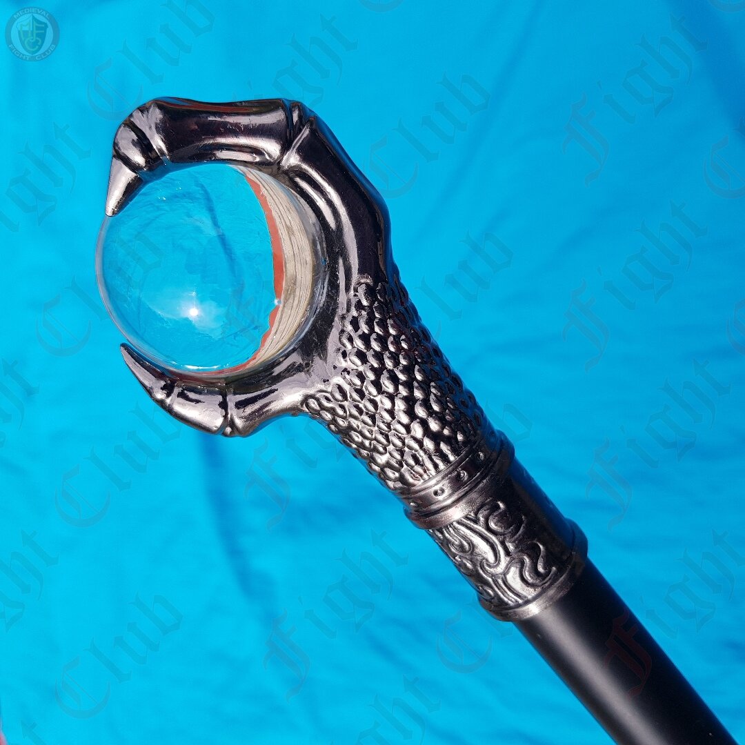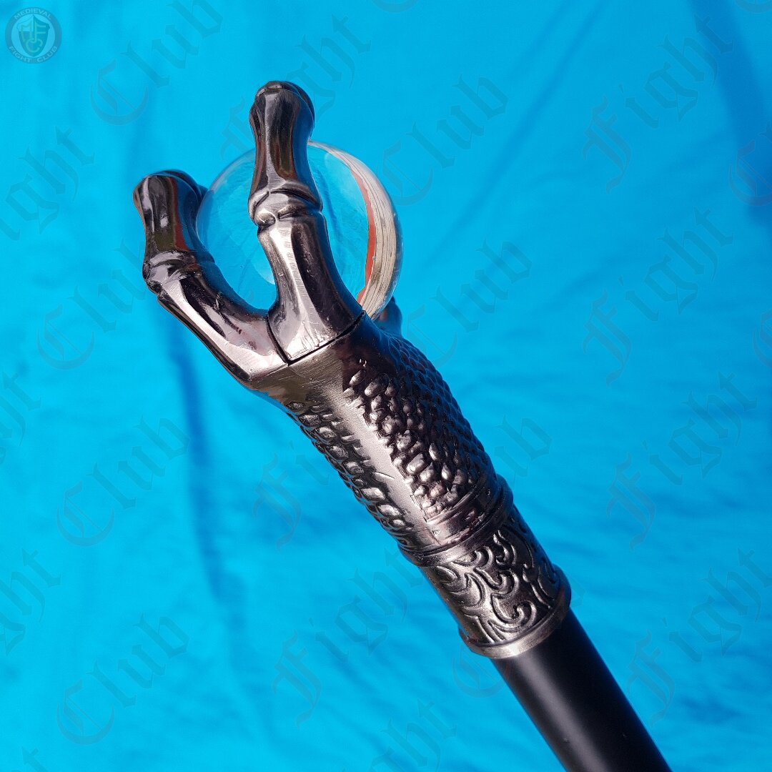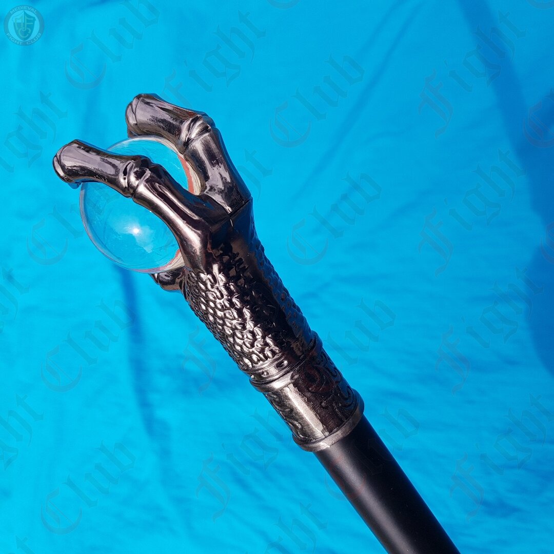 This cane has a tapered, matte black length topped with a claw grasping a crystal ball such that it is secure but still able to be turned in its position between the talons.