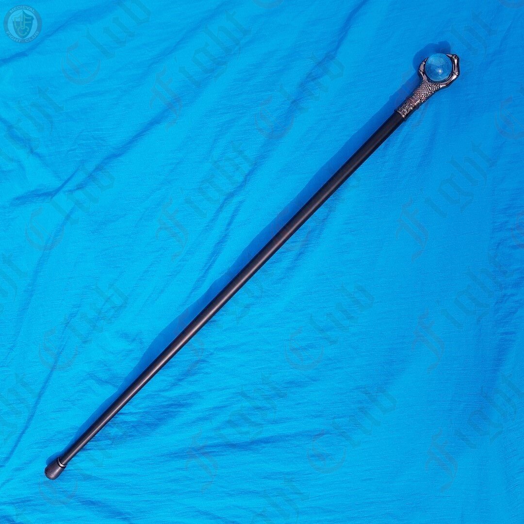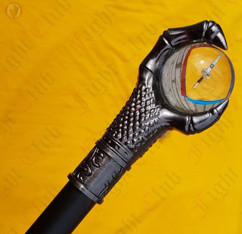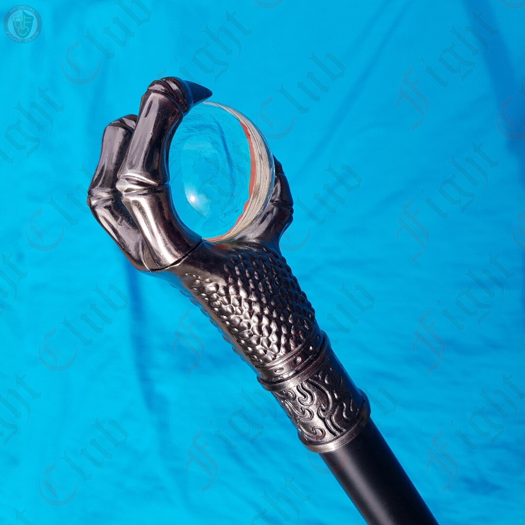 This cane has a tapered, matte black length topped with a claw grasping a crystal ball such that it is secure but still able to be turned in its position between the talons.