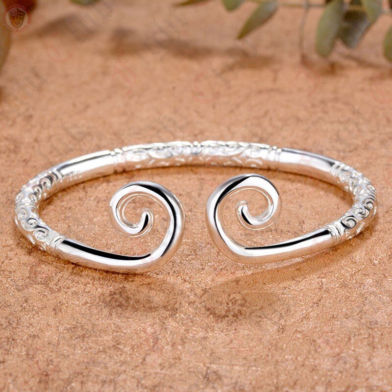 This torc wristband features curled terminals and intricate curled motifs in three sections along its length. Silver in colour, this torc is made of a metal alloy.