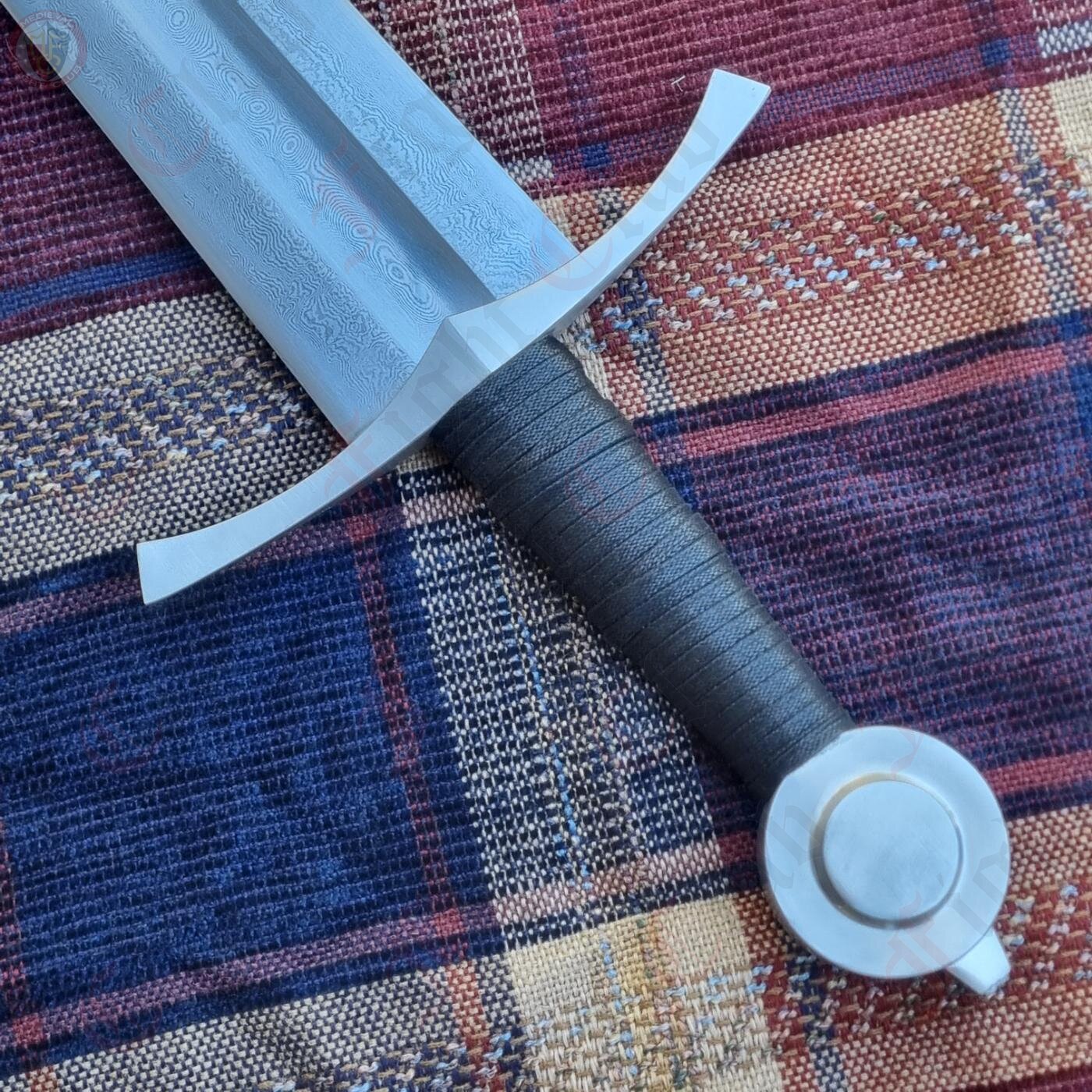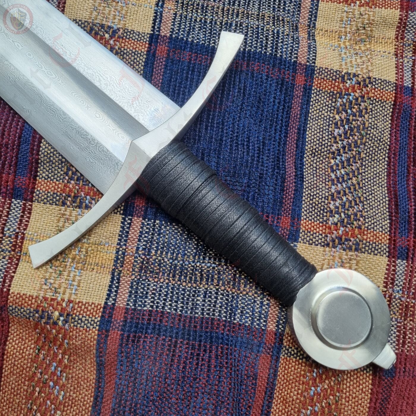 This arming sword is a sharp, practical, and combat-ready weapon crafted for dedicated practitioners and collectors. It features a full tang, high carbon Damascus steel blade fitted to a leather wrapped handle and wheel pommel, as well as a leather wrapped wooden scabbard and arming belt.