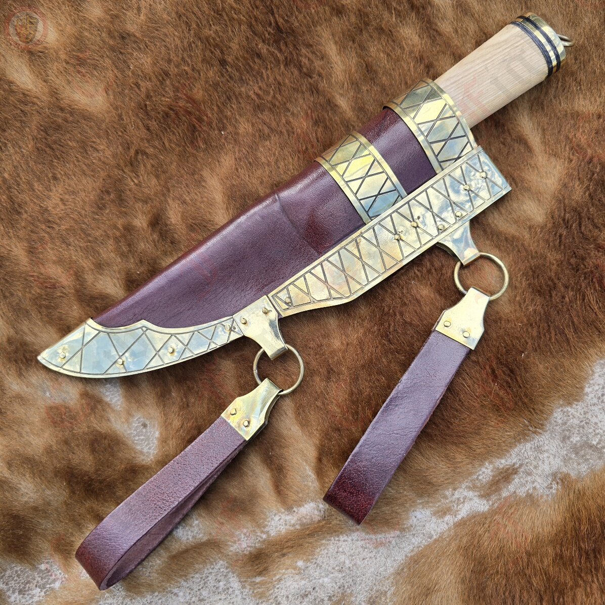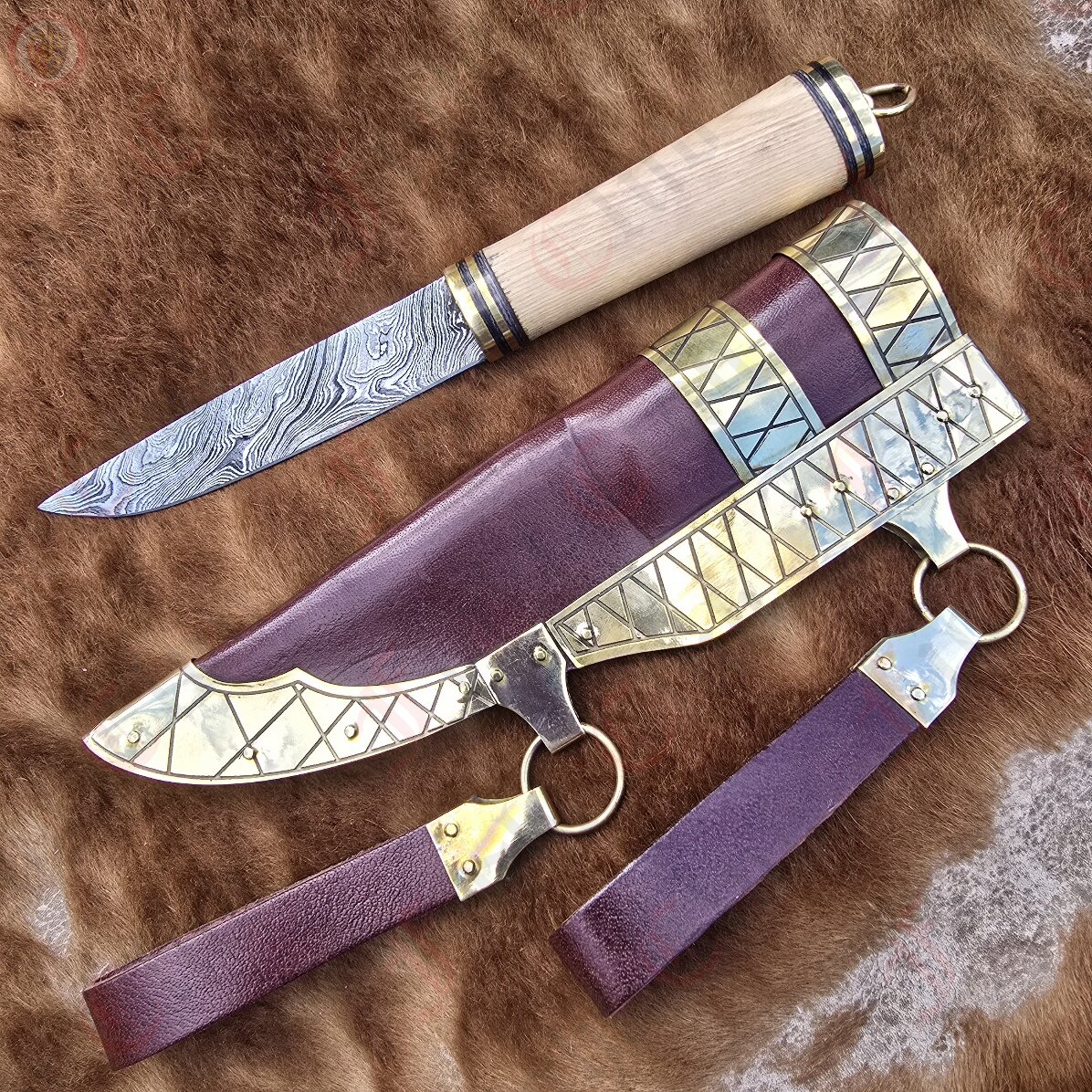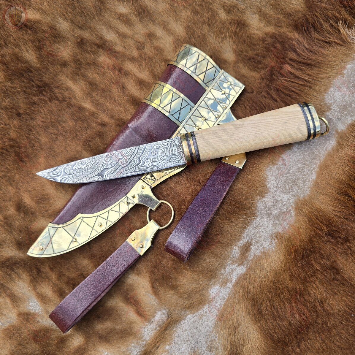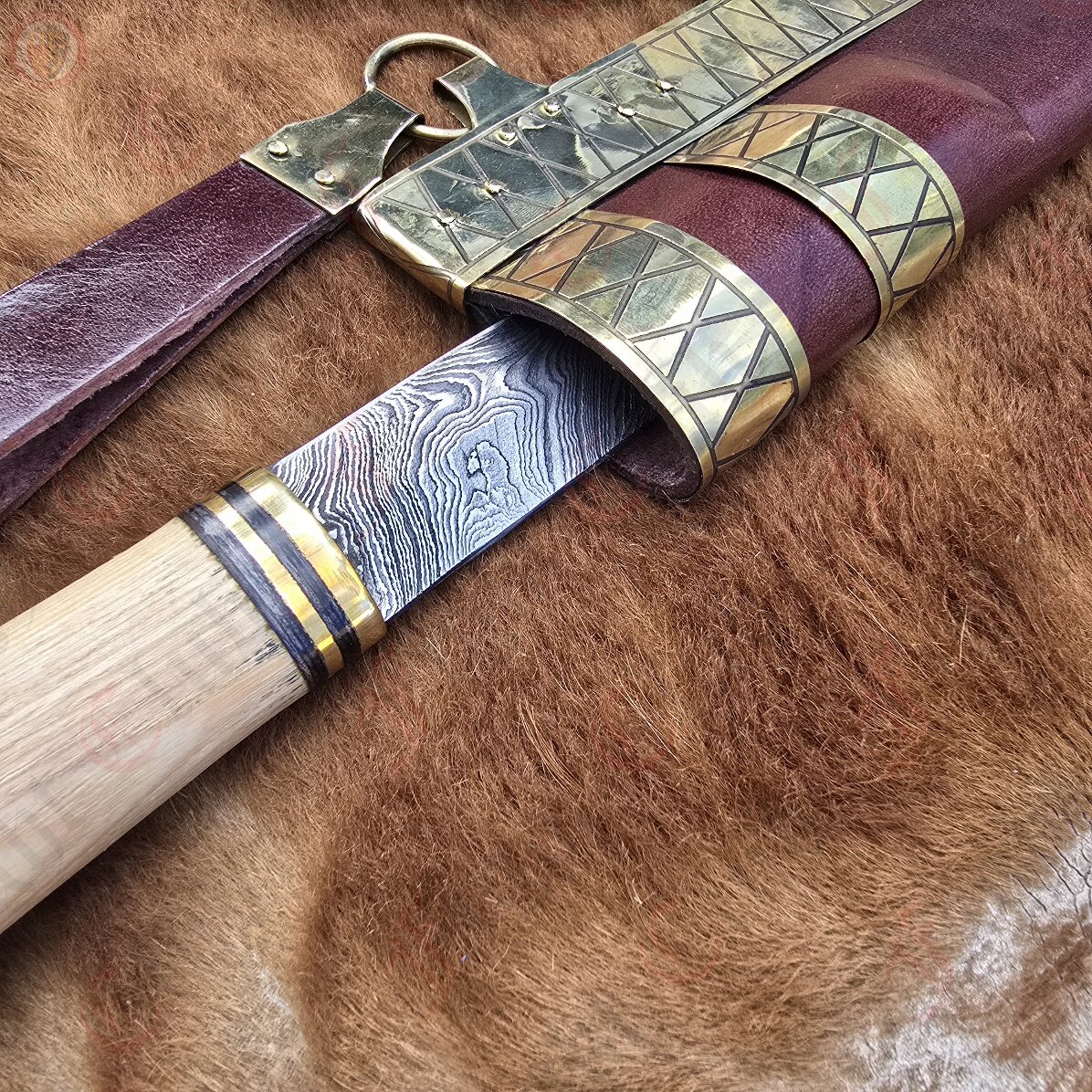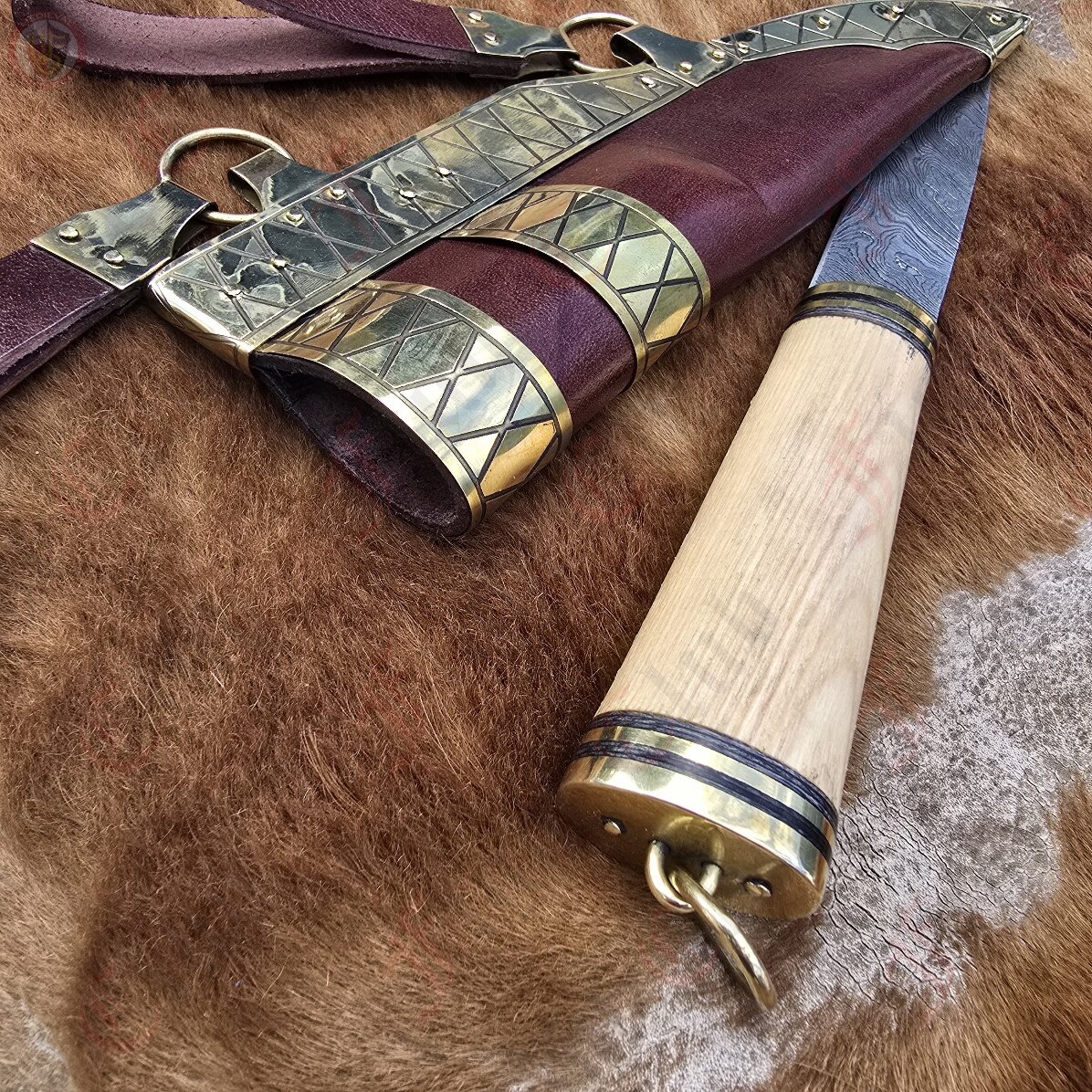 This seax manages to be not only a sharp, practical and robust cutting tool, but also a pure work of art and style with a mesmerising Damascus steel blade, etched horn and polished wood handle, and a brass plated and decorated thick leather scabbard. This seax truly has it all.