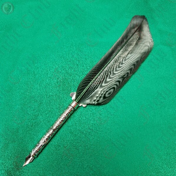 This quill is made from a dark green feather, silver coloured metal cylinder and comes with an array of 6 steel nibs. It measures approx. 25cm overall with the steel cylinder & nib measuring 8.5cm in length.