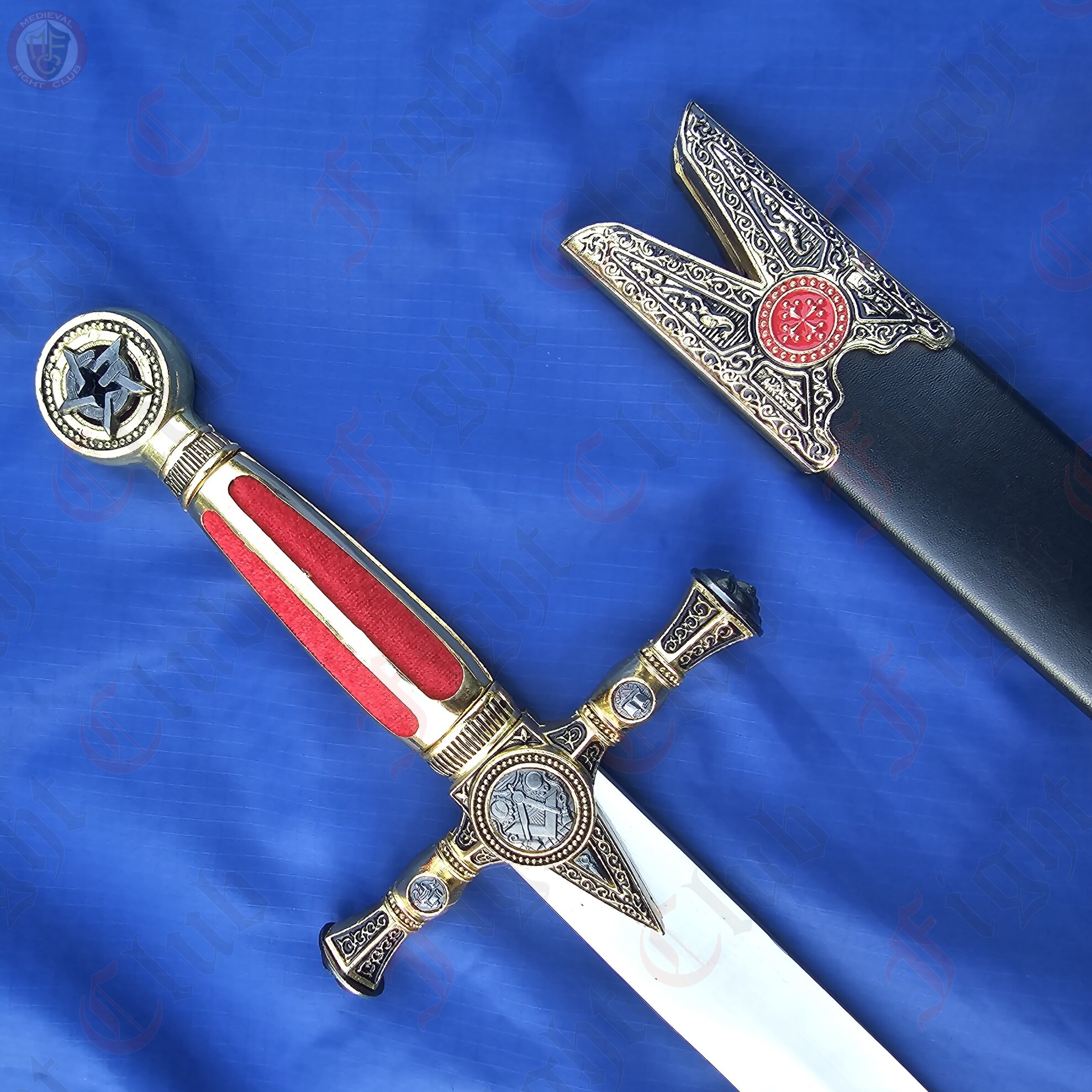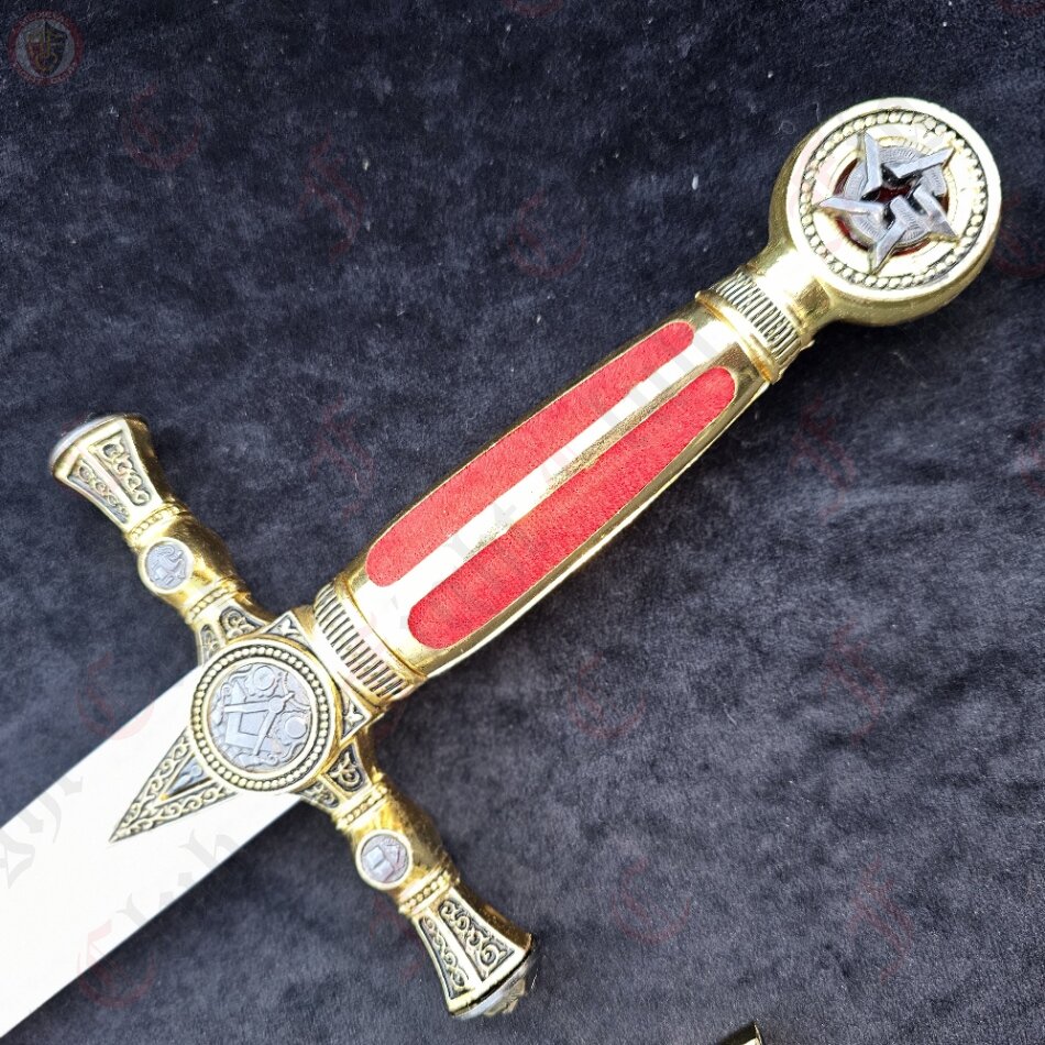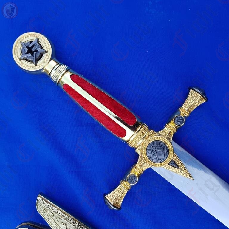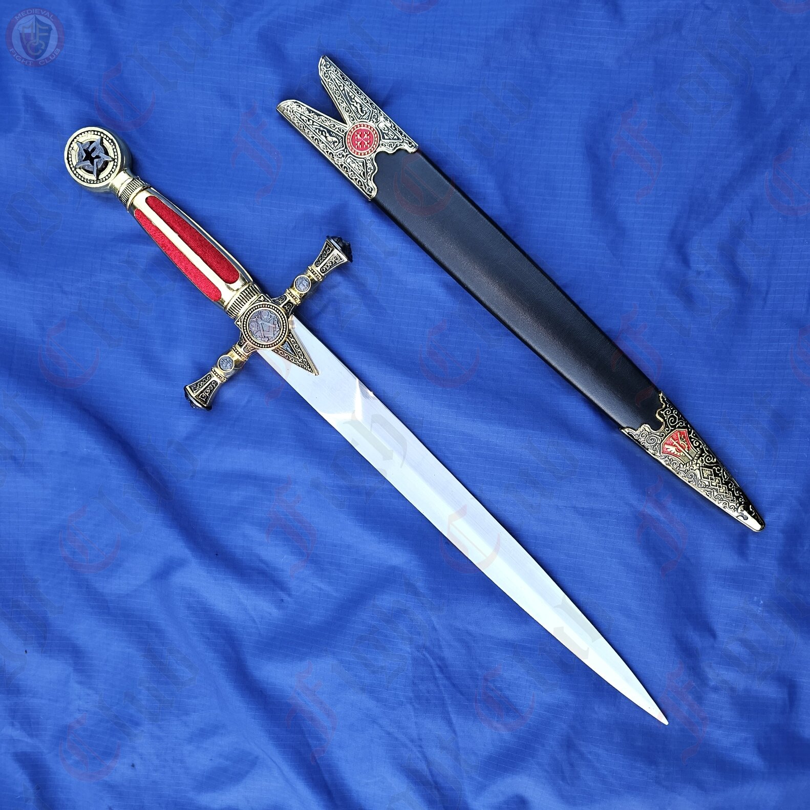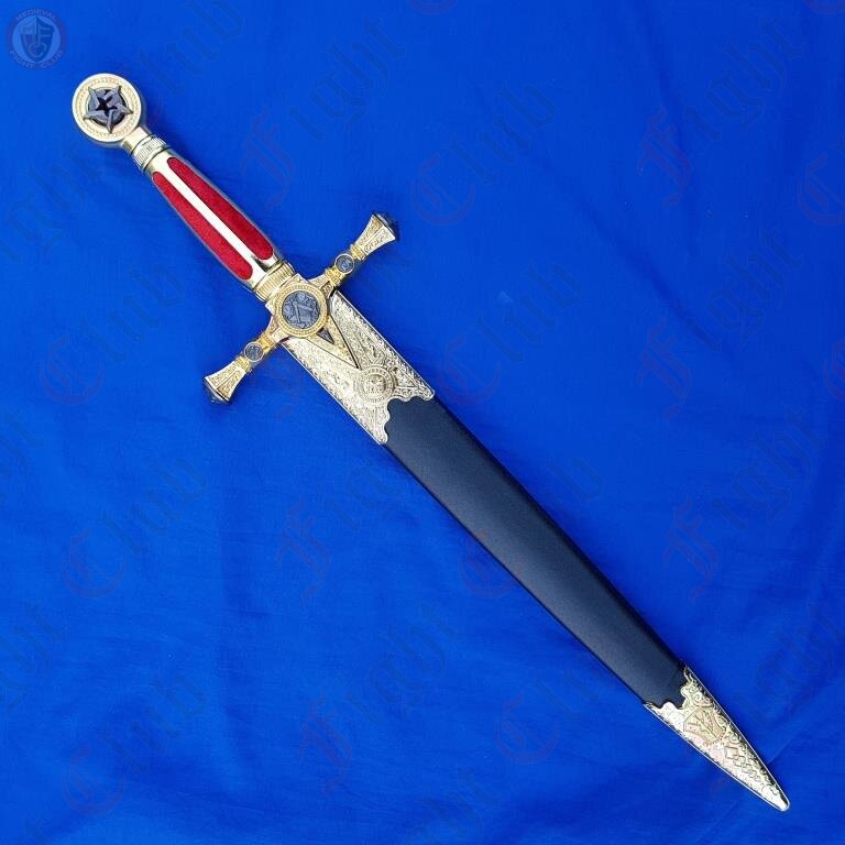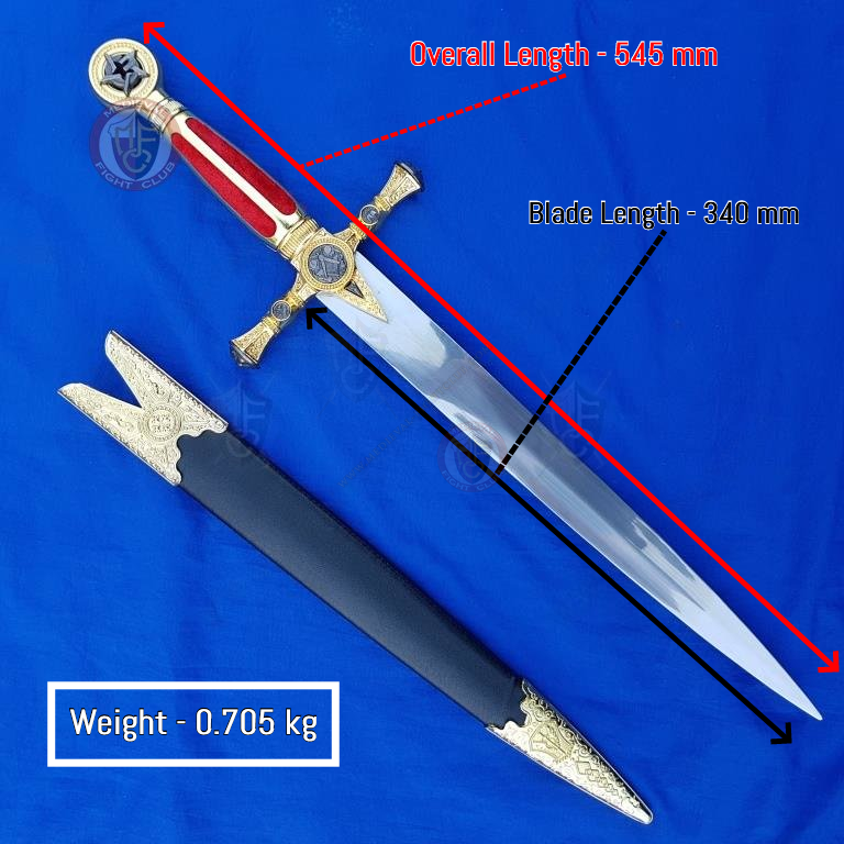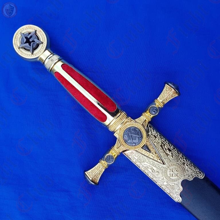 This dagger features a velvet like grip, a steel blade with the masonic square and compasses on the hilt. The cross guard features faces on each terminal. The faux leather scabbard is finished with a metal chape and locket.