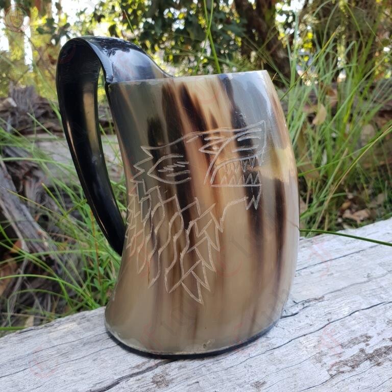Clean & polished with a horn base, this tankard features the Dire Wolf sigil engraved on one side. This is a very large drinking tankard with approx 450 mL capacity, Plenty of room for mead or beer - a mug fit for any King or bastard of the north!