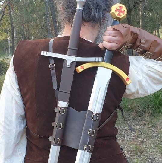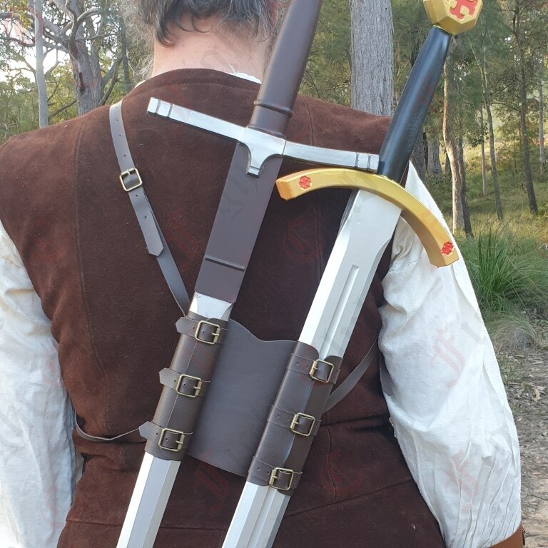 It enables you to carry 2 swords (or other weapons) on the same shoulder just like in the Witcher game series. Adjustable buckles to modify for the best fit.