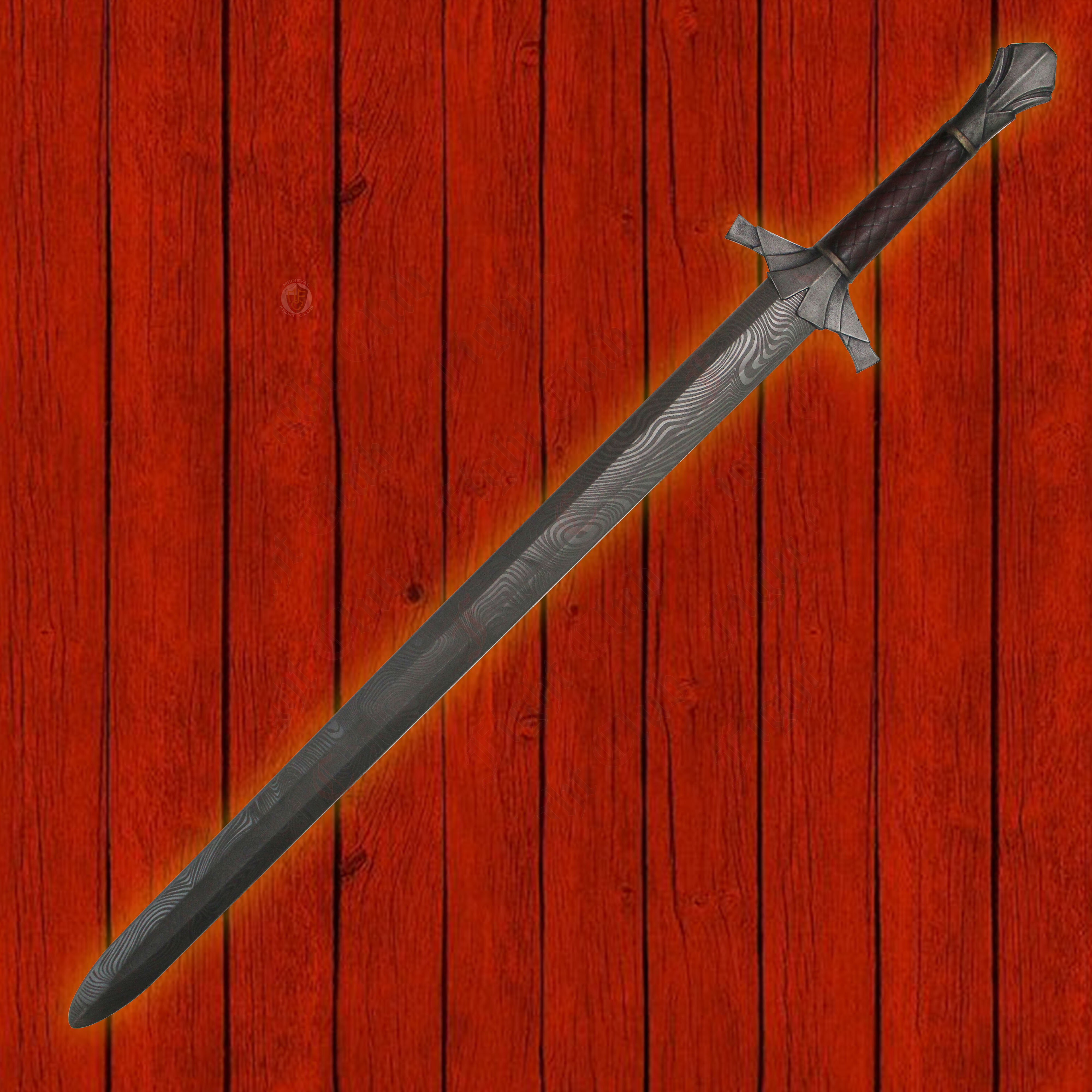 A weapon perfect for LARP and cosplay. A stylish blade with a unique pattern weld design and unique handle design with overlapping plates and flutes.