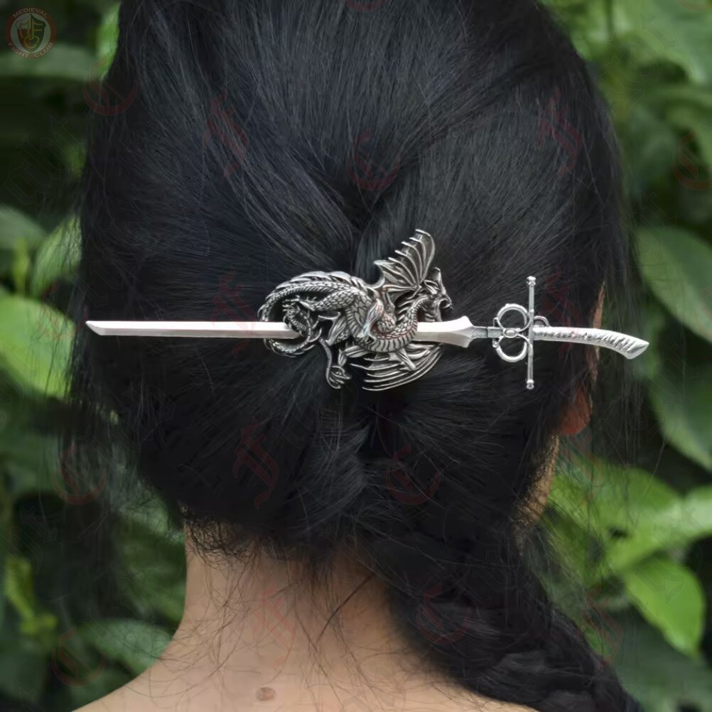 A hair barrette depicting a dragon being slain by a great sword. Evoking tales of legend like St. George and the dragon or Sigurd and the serpent. The dragon acts as the decoration on your hair and the sword as the pin to hold it all together.