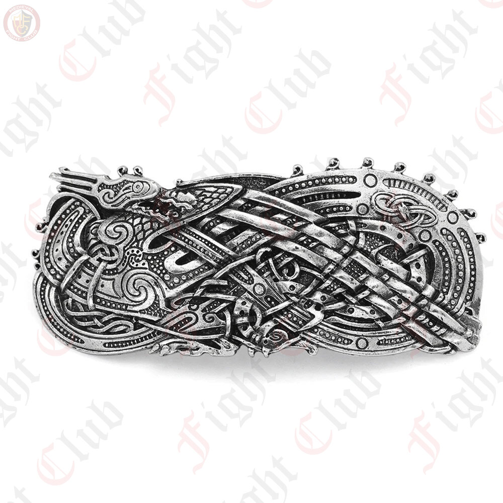 Elevate your style with our lovely silver-toned hair clip, meticulously crafted from durable metal and adorned with a striking Viking-inspired Dragon motif. This accessory not only adds a touch of sophistication to your hair but also embodies the fierce elegance of Viking design. Embrace the spirit of the warrior with this unique hair clip that seamlessly blends strength and style. Make a statement – adorn your locks with the regal allure of our Viking-inspired Dragon hair clip.