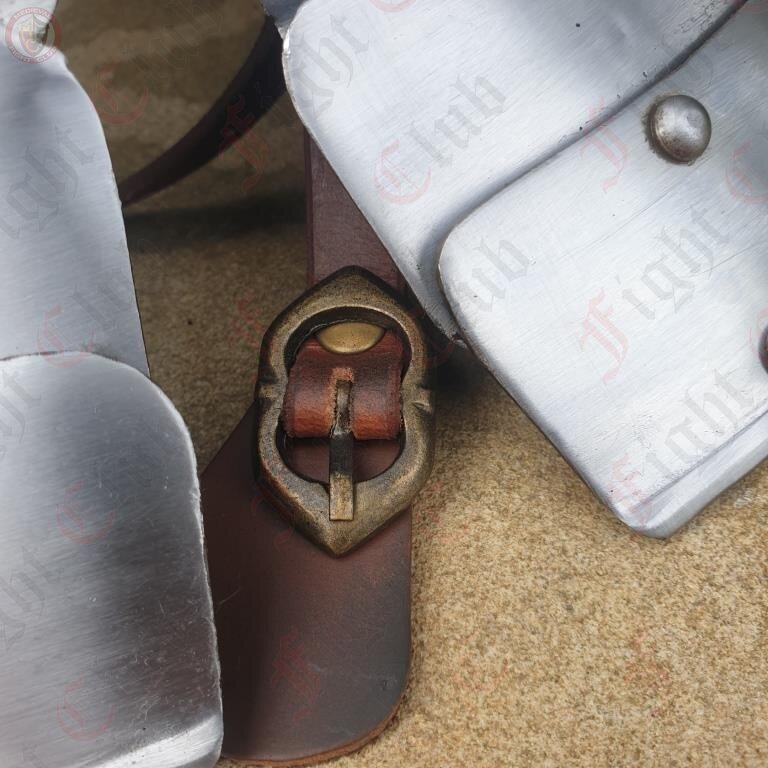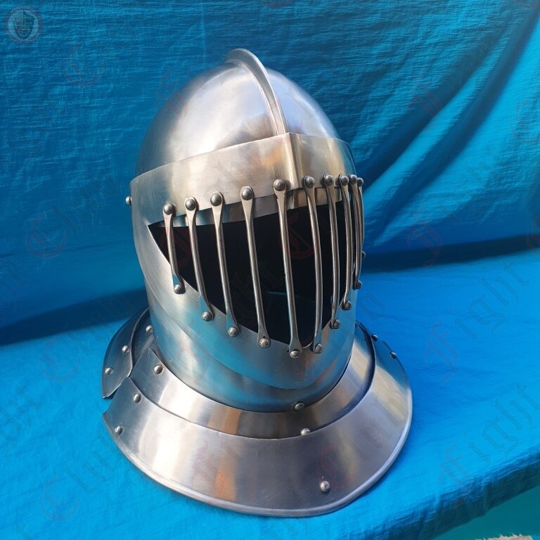 This helm has a round crown with a small ridge-like crest at the top which provides additional support and deflection. The helmet also features an articulated, barred visor to increase vision and ease breathing without sacrificing too much face protection. The helmet is 14 gauge mild steel, and sports an adjustable leather lining and chin strap.