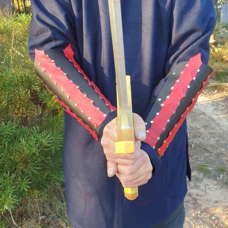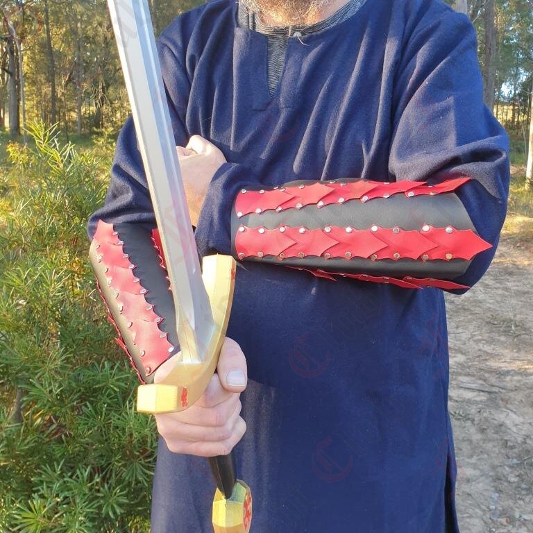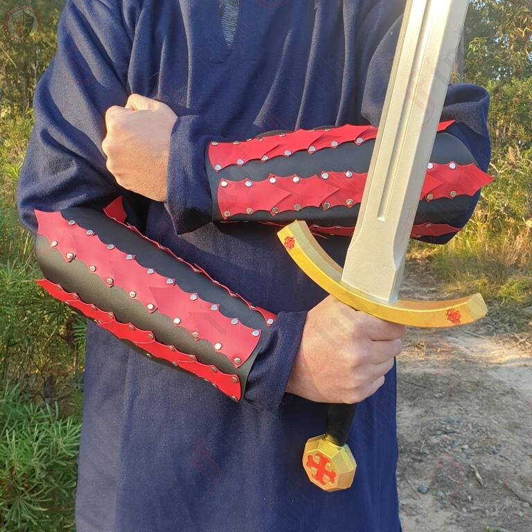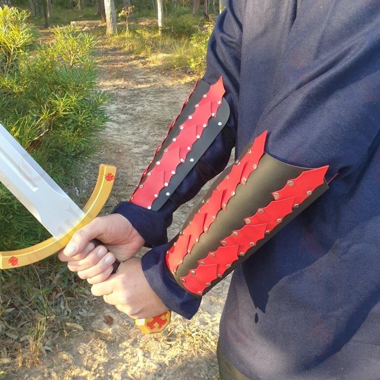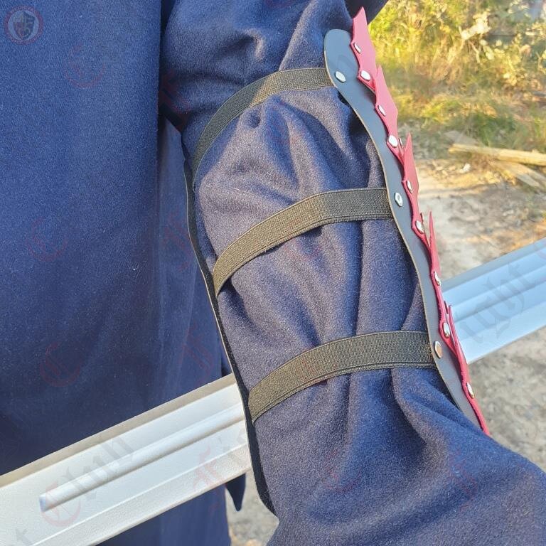 A pair of spiked fantasy epic armour arm guards in black and red.