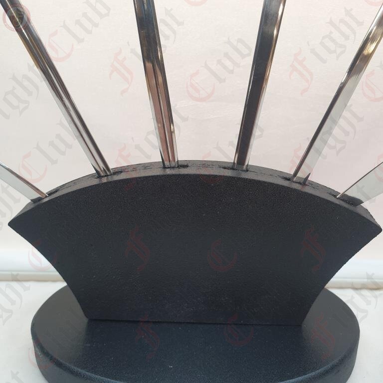 A collectors' set of six letter openers with a wooden stand. Each sword is made from stainless steel and will not tarnish.
