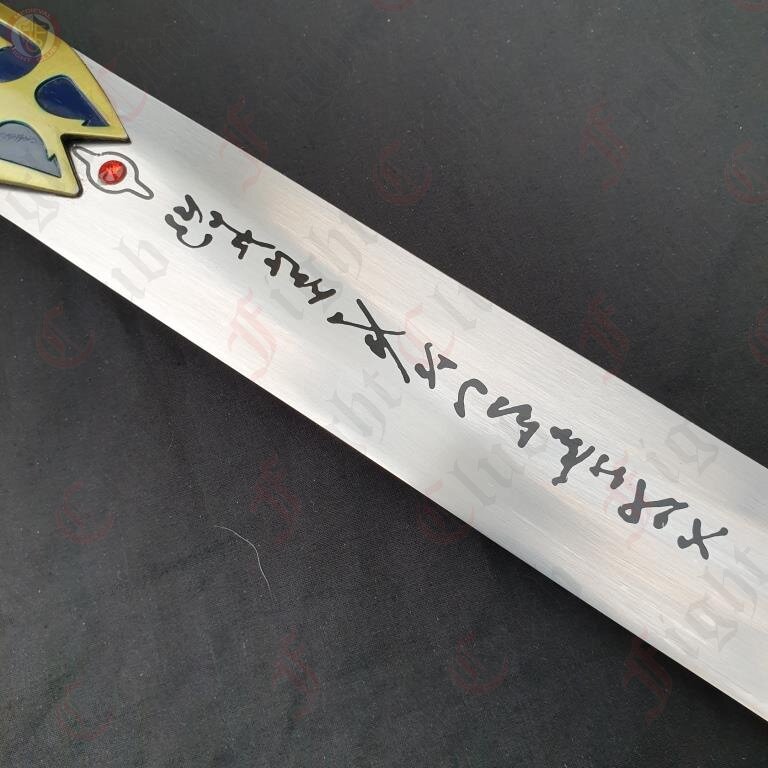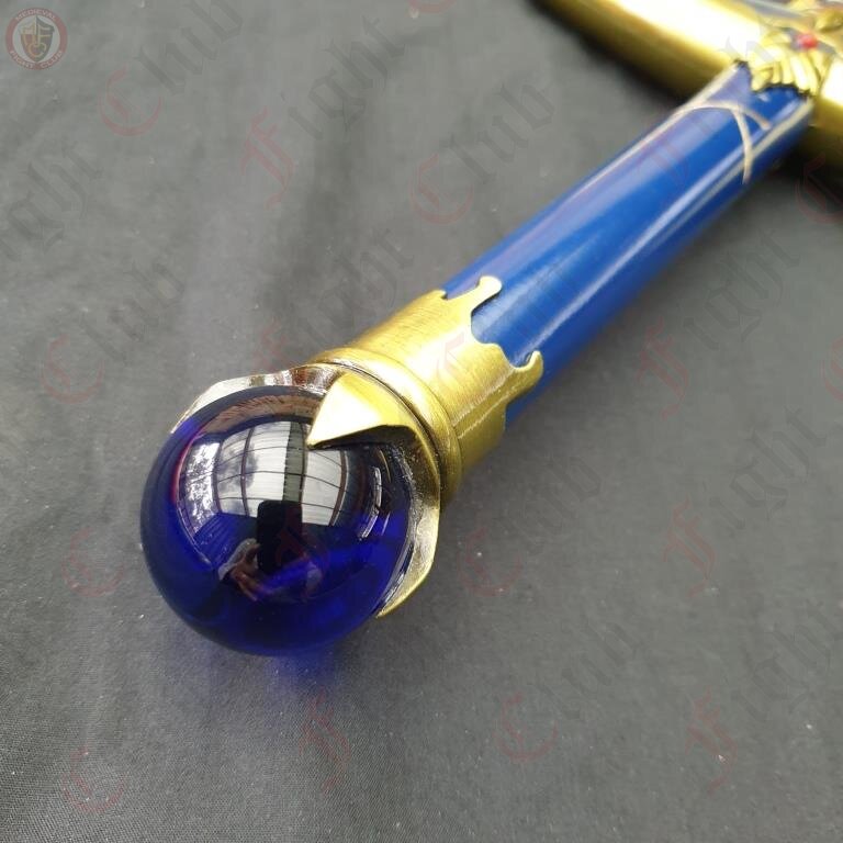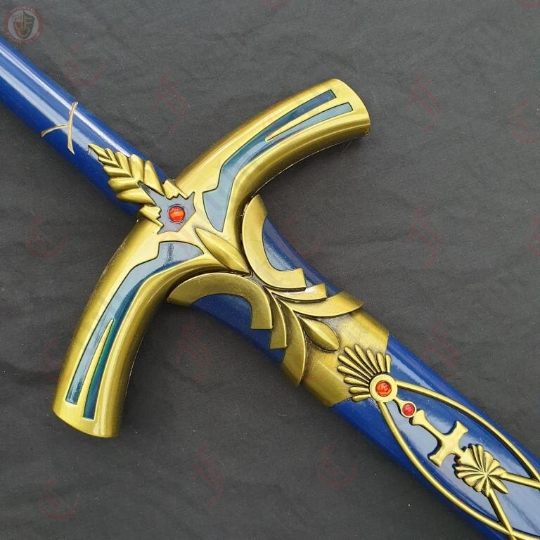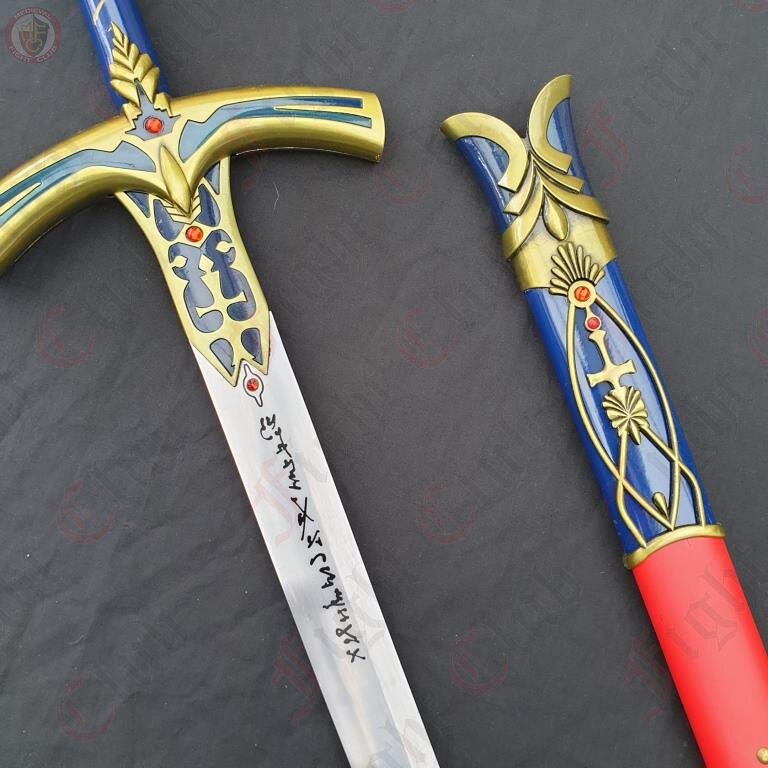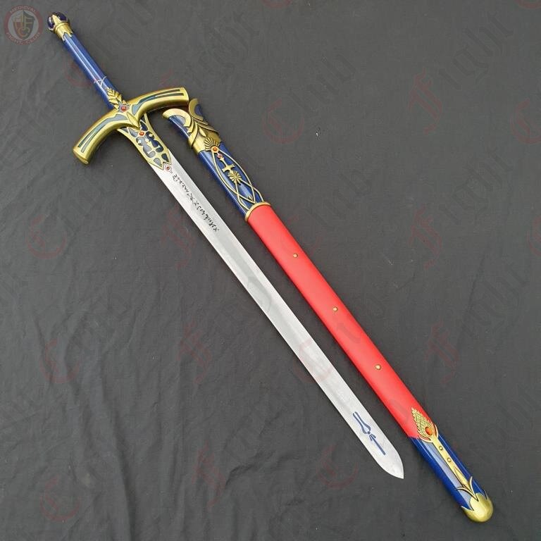 Caliburn is the storied Sword in the Stone of Arthurian legend. According to some readings, it may be the same as Excalibur, however some say that Excalibur is a different holy sword, given by the Lady in the Lake, and not the same as Caliburn. In any case, the sword(s) are a piece of great fancy, many works of fiction incorporate and develop the characters of the legend and the sword into their own works. One such example is the popular Fate anime series, from which this blade design hails.